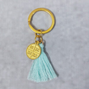 Μαρτυρικά βάπτισης μπρελόκ με χρυσή χάντρα, κωνσταντινάτο και εκρού φούντα σε κουτί 50 τμχ.