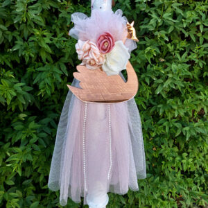Ρομαντική λαμπάδα βάπτισης για κορίτσι με γαλλική δαντέλα, σατέν κορδέλες, τούλι και λουλούδι.