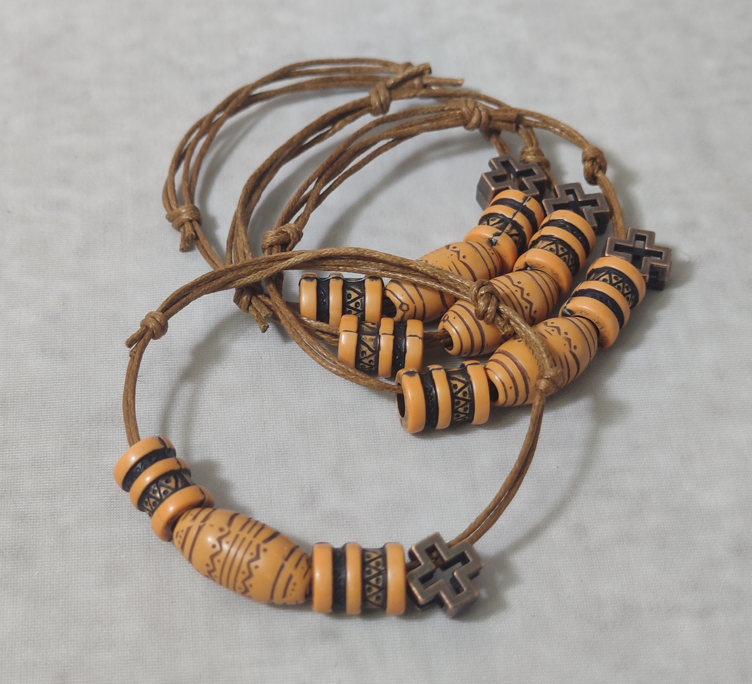 Μαρτυρικά βάπτισης βραχιόλια Boho με διπλό σχοινί και ξύλινες ανάγλυφες χάντρες με μεταλλικό σταυρουδάκι.