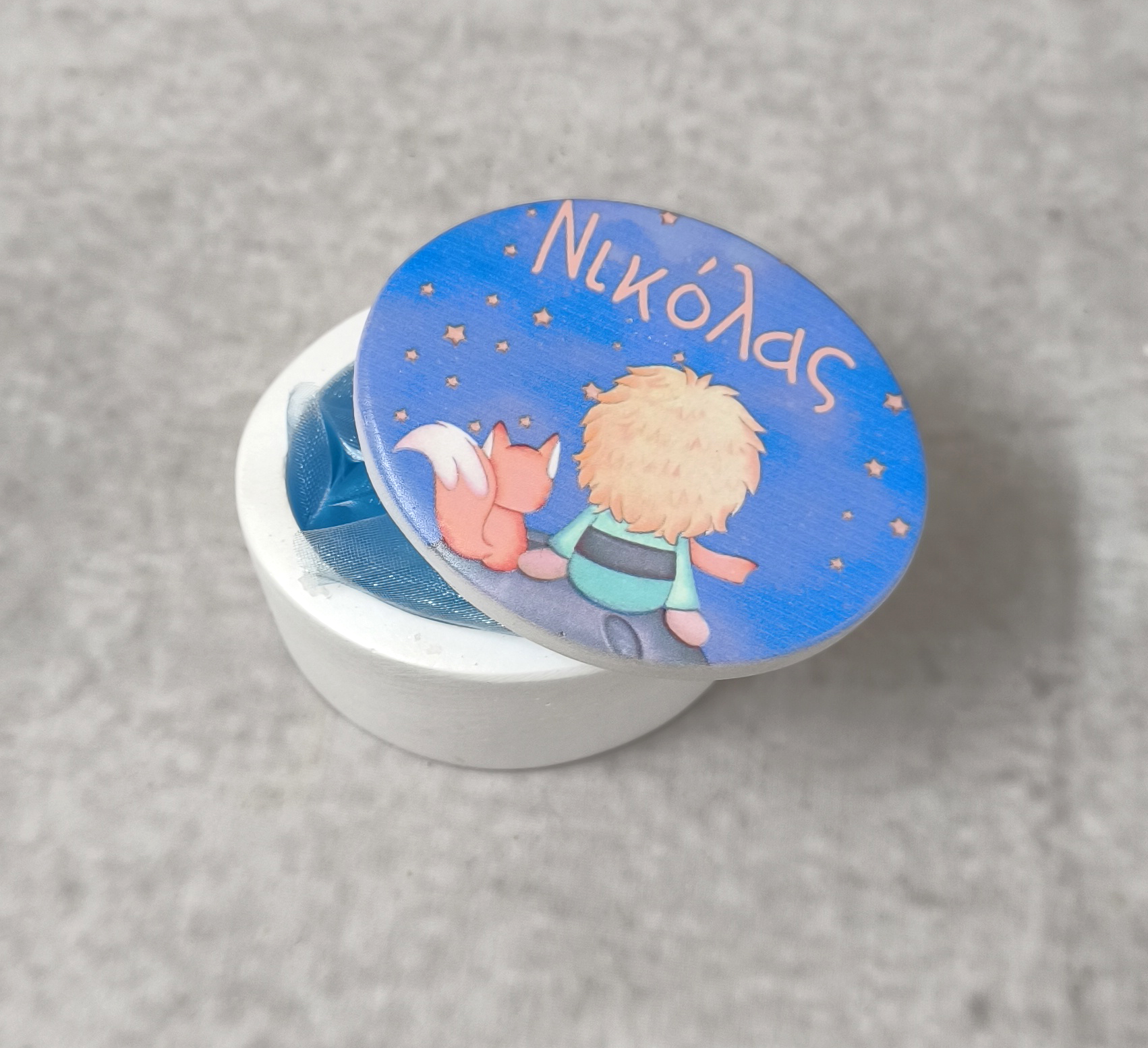 Μπομπονιέρα βάπτισης εκτυπωμένη κεραμική μπιζουτιέρα με θέμα Μικρός Πρίγκιπας. Εσωτερικά περιέχει γαλάζιο τούλι και 7 κουφέτα smarties.
