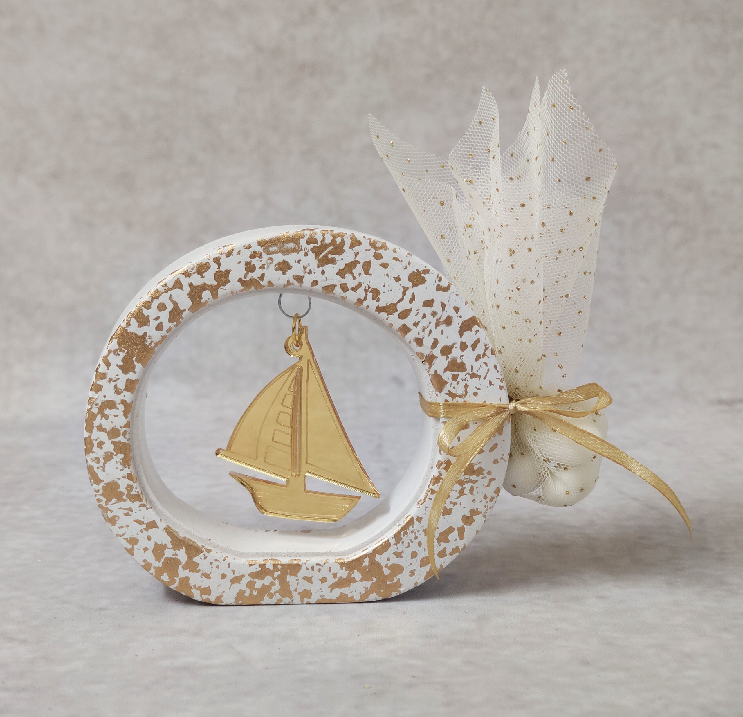Μπομπονιέρα γάμου – βάπτισης κεραμική σε λευκό και χρυσό χρώμα με κρεμαστό καράβι από χρυσό καθρέφτη plexi glass, δεμένη με χρυσή σατέν κορδέλα, χρυσό glitter τούλι και 5 κουφέτα αμυγδάλου ή 3 κουφέτα αμυγδάλου και 2 σοκολατένιες καρδιές ή 7 κουφέτα smarties.