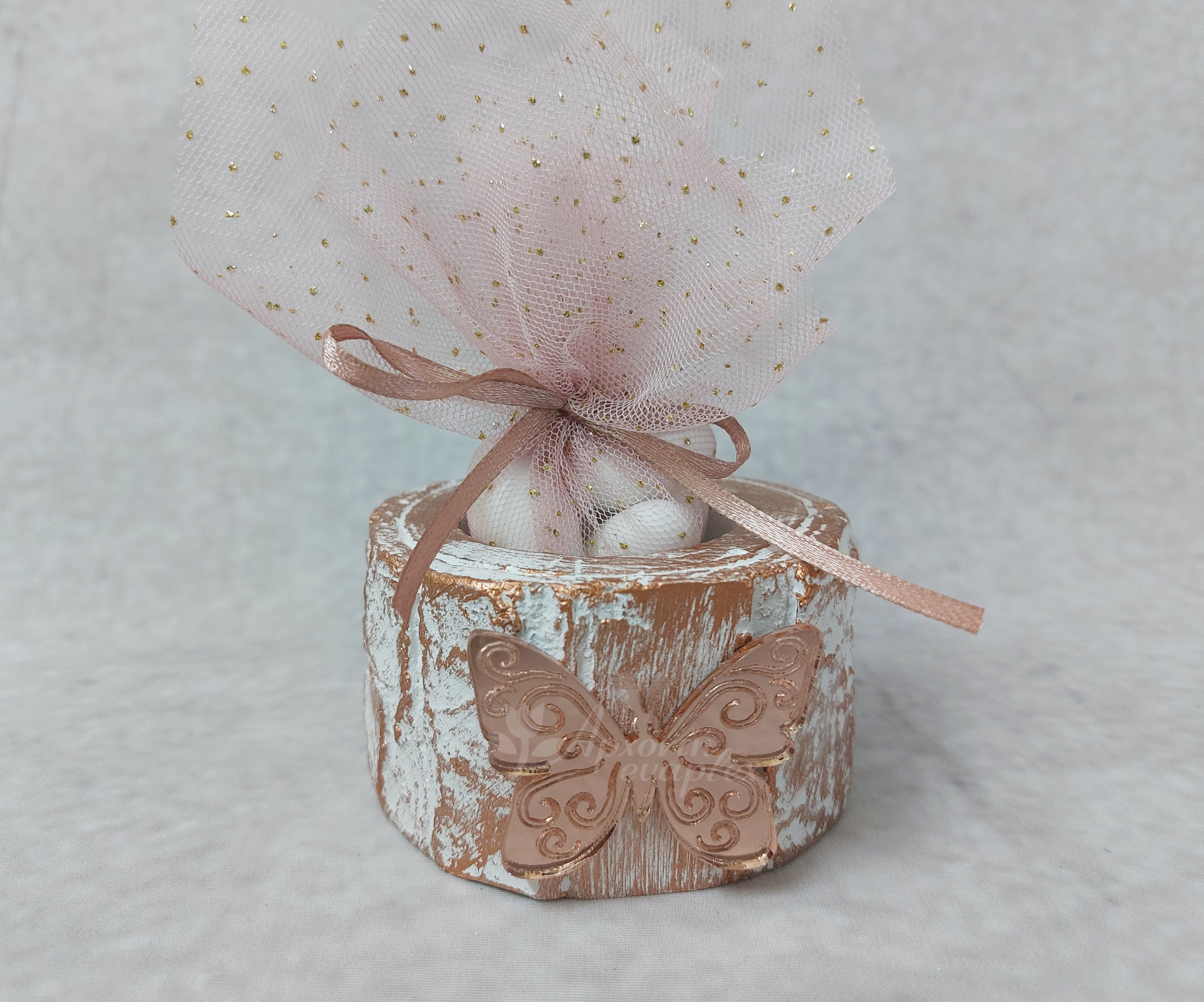 Μπομπονιέρα βάπτισης κεραμικό ρεσώ με πεταλούδα από χρυσό καθρέφτη plexi glass.