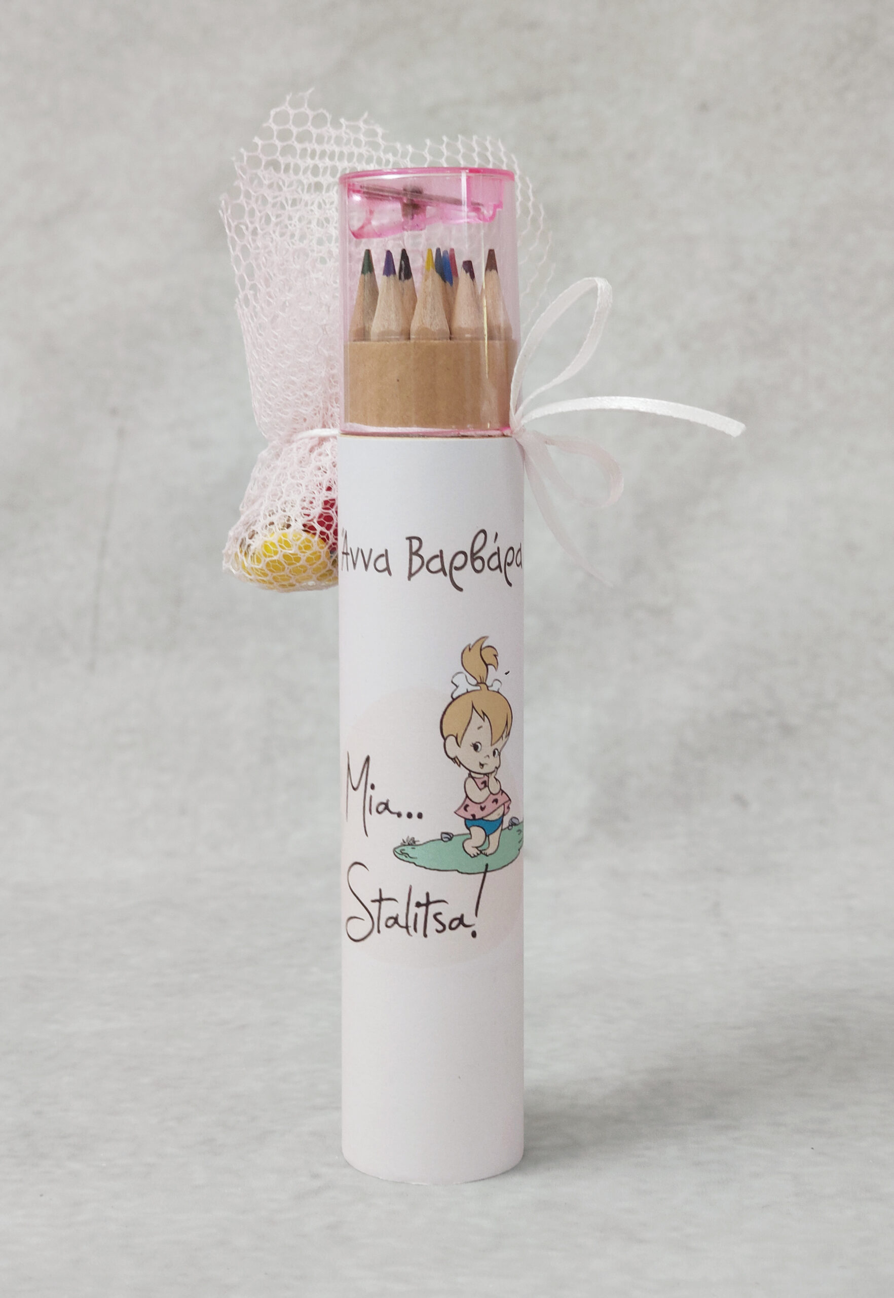 Μπομπονιέρα βάπτισης ξυλομπογιές με θέμα Σταλίτσα δεμένη με σατέν ροζ κορδέλα σε ροζ δίχτυ και 7 κουφέτα smarties.