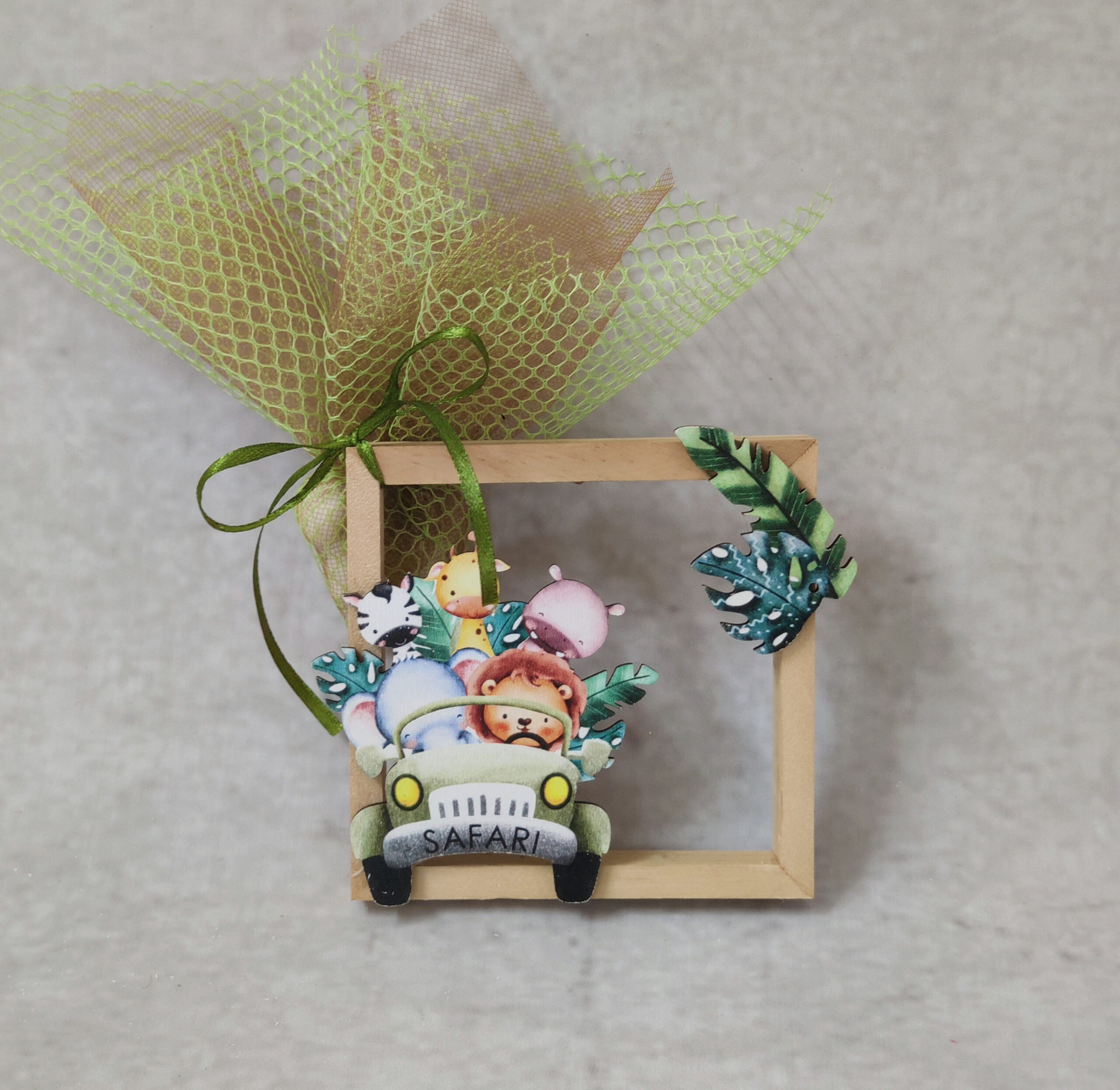 Μπομπονιέρα βάπτισης ξύλινο καδράκι με θέμα Safari σε σοκολα τουλι και πράσινο δίχτυ.