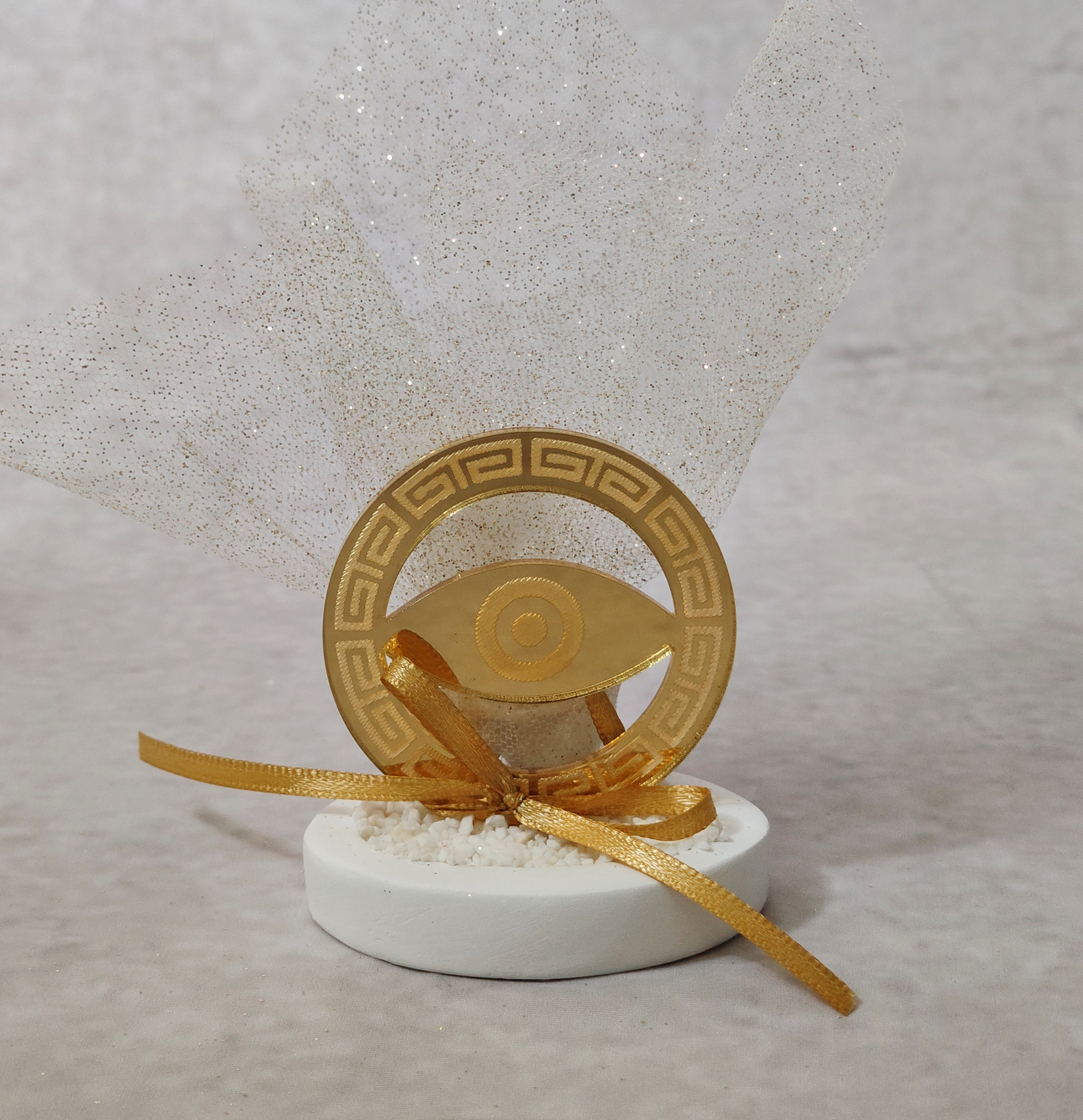 Μπομπονιέρα γάμου κεραμική με κρεμαστό κύκλο μάτι από χρυσό καθρέφτη plexi glass με χάραξη.