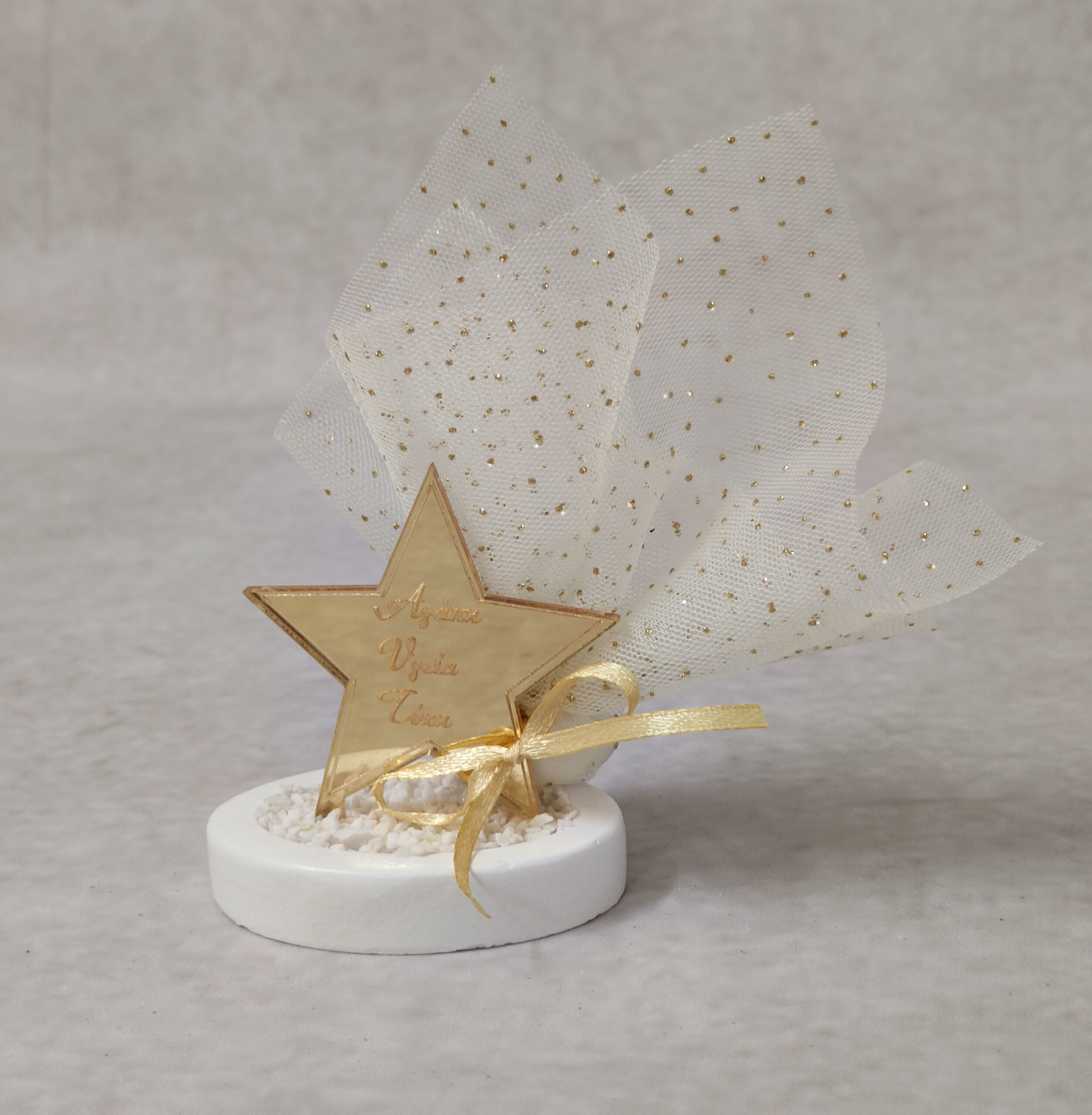 Μπομπονιέρα γάμου – βάπτισης αστέρι από χρυσό καθρέφτη plexi-glass σε λευκή βάση με πετραδάκια, δεμένη με χρυσή σατέν κορδέλα, χρυσό glitter τούλι και 5 κουφέτα αμυγδάλου ή 3 κουφέτα αμυγδάλου και 2 σοκολατένιες καρδιές ή 7 κουφέτα smarties.