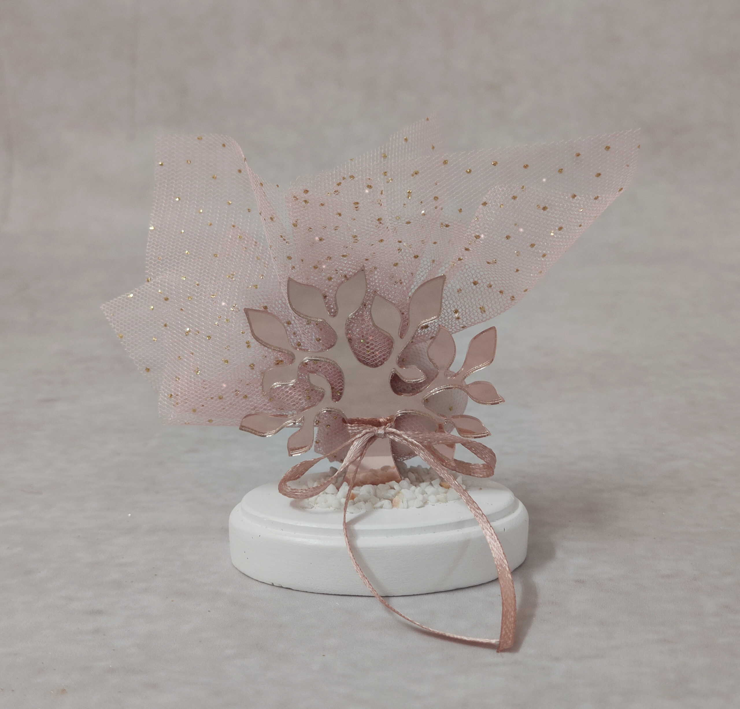 Μπομπονιέρα γάμου – βάπτισης δέντρο ζωής από ροζ χρυσό καθρέφτη plexi-glass σε λευκή βάση με πετραδάκια, δεμένη με ροζ σατέν κορδέλα, ροζ glitter τούλι και 5 κουφέτα αμυγδάλου ή 3 κουφέτα αμυγδάλου και 2 σοκολατένιες καρδιές ή 7 κουφέτα smarties.