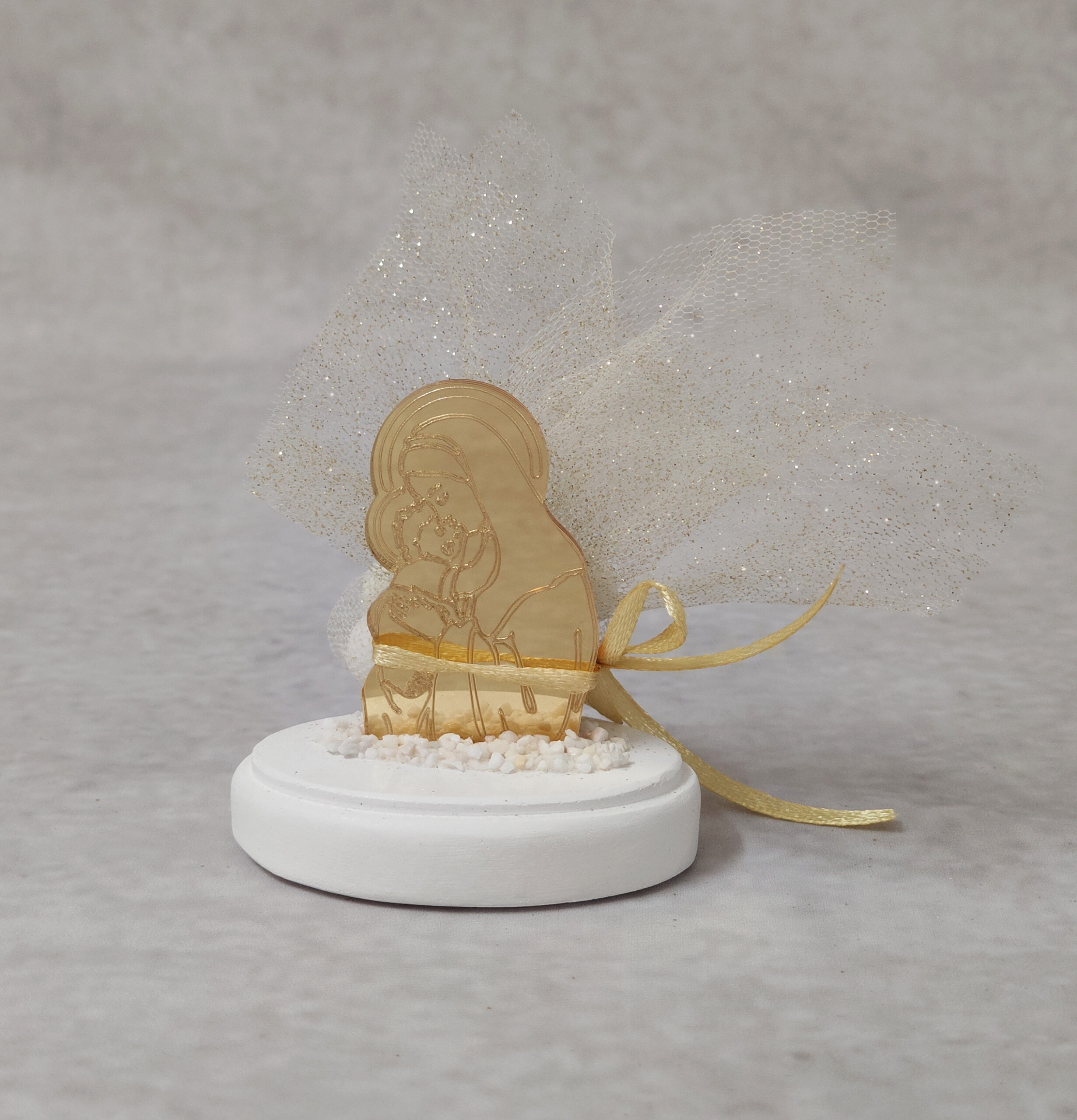 Μπομπονιέρα γάμου – βάπτισης Παναγία – Χριστός από χρυσό καθρέφτη plexi-glass σε βότσαλο.