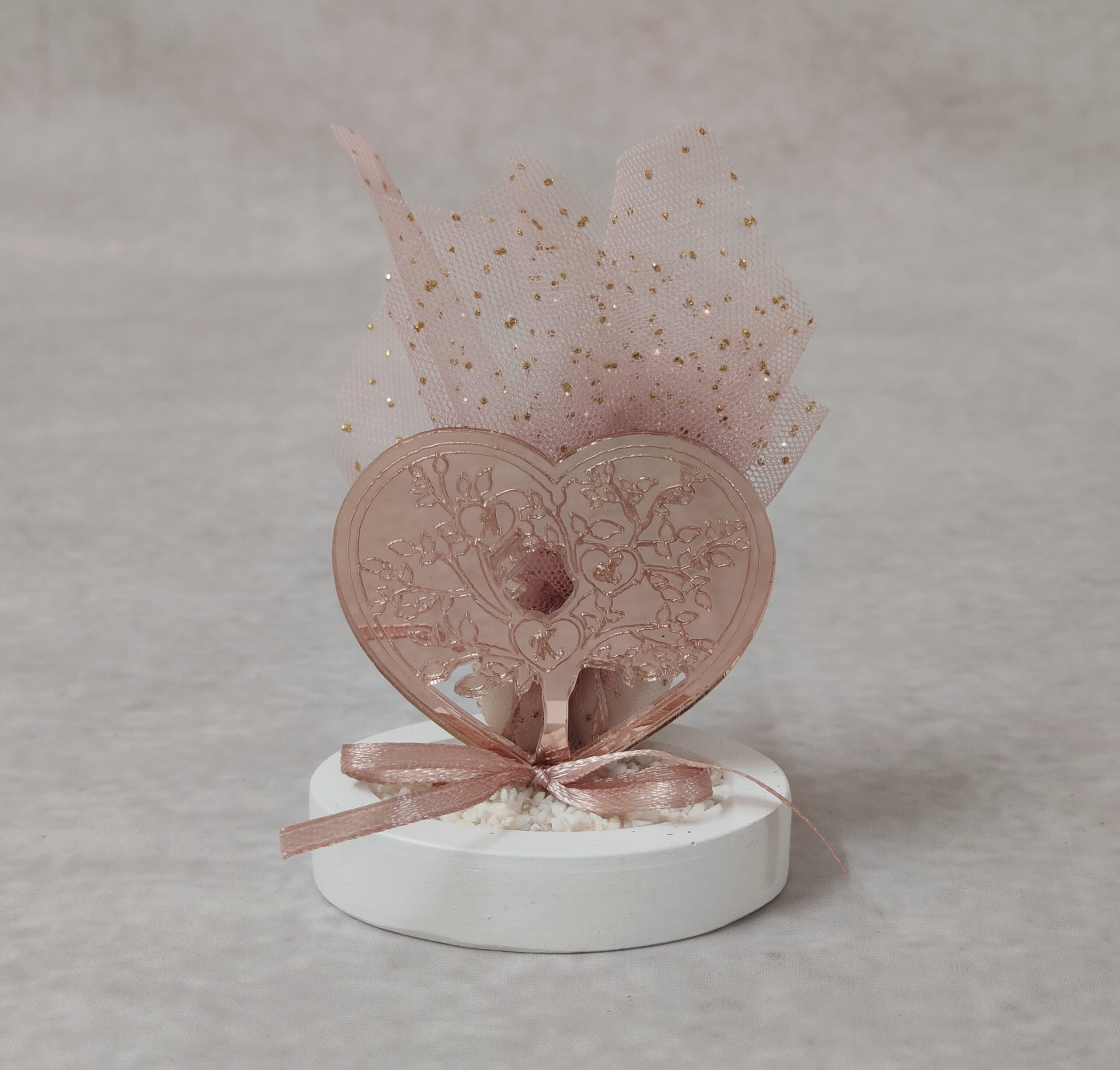 Μπομπονιέρα γάμου καρδιά από ροζ χρυσό καθρέφτη plexi-glass σε λευκή βάση με πετραδάκια, δεμένη με ροζ σατέν κορδέλα, ροζ glitter τούλι και 5 κουφέτα αμυγδάλου ή 3 κουφέτα αμυγδάλου και 2 σοκολατένιες καρδιές ή 7 κουφέτα smarties.