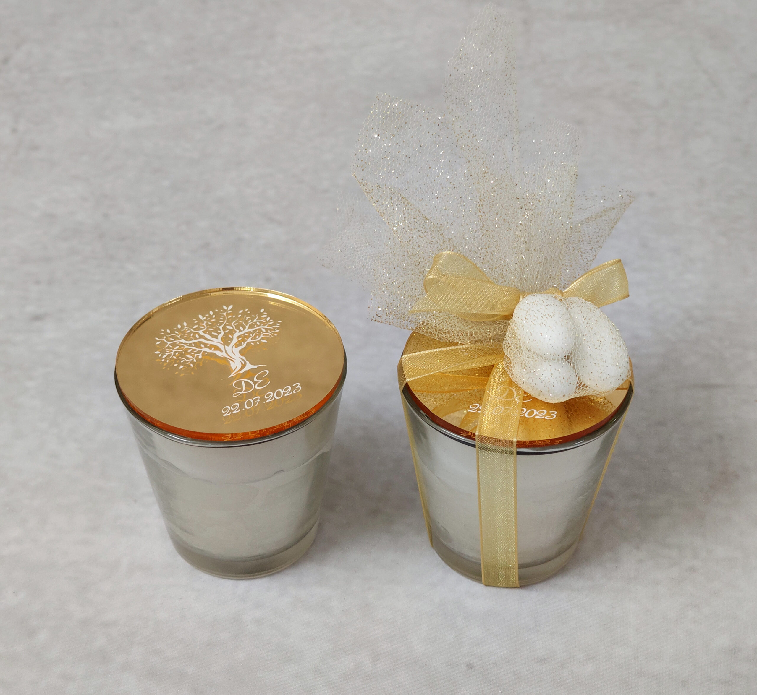 Μπομπονιέρα γάμου κερί με καπάκι από χρυσό καθρέφτη plexi glass.
