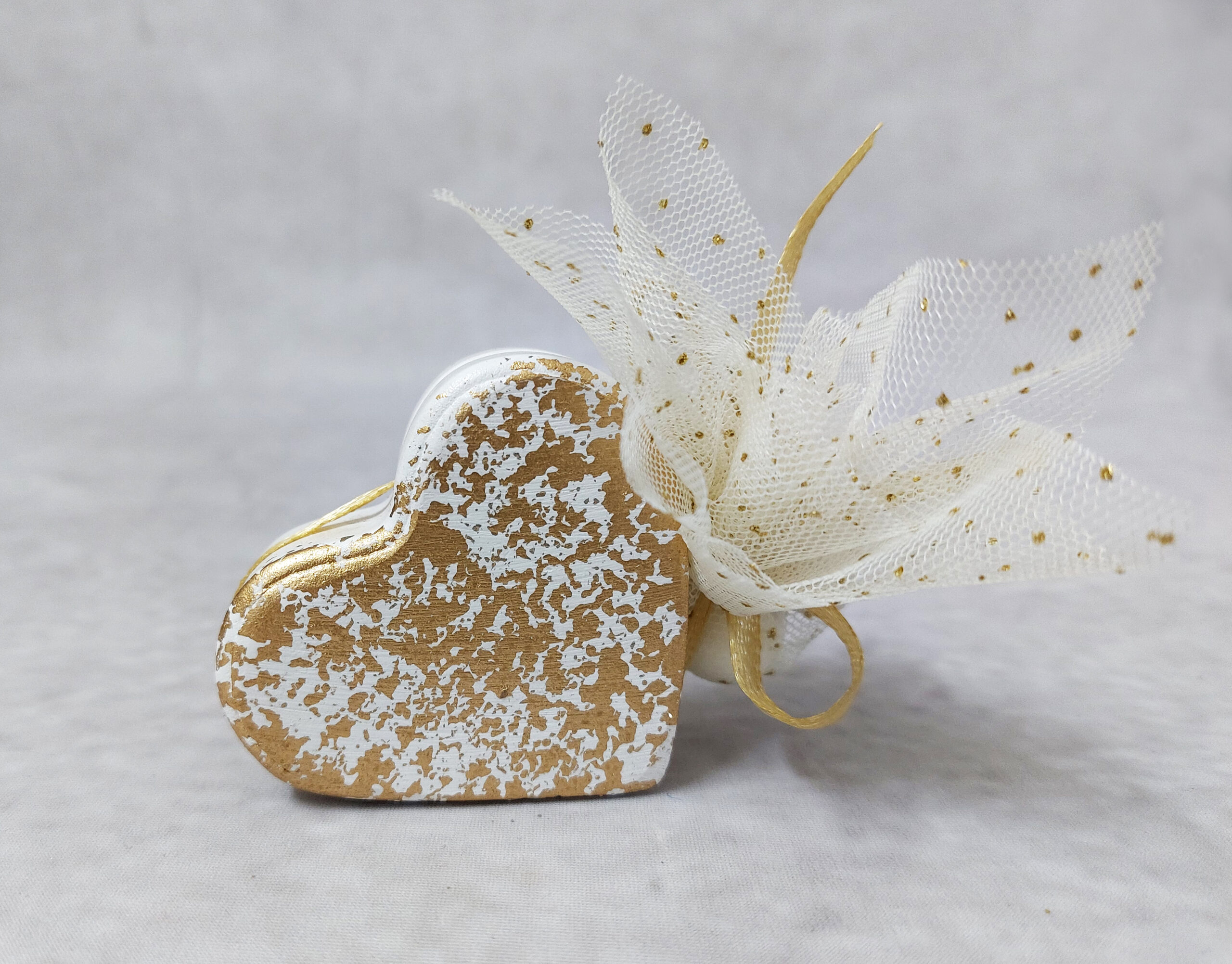 Μπομπονιέρα γάμου – βάπτισης κεραμική καρδιά δεμένη με χρυσή σατέν κορδέλα, χρυσό glitter τούλι και 5 κουφέτα αμυγδάλου ή 3 κουφέτα αμυγδάλου και 2 σοκολατένιες καρδιές ή 7 κουφέτα smarties.