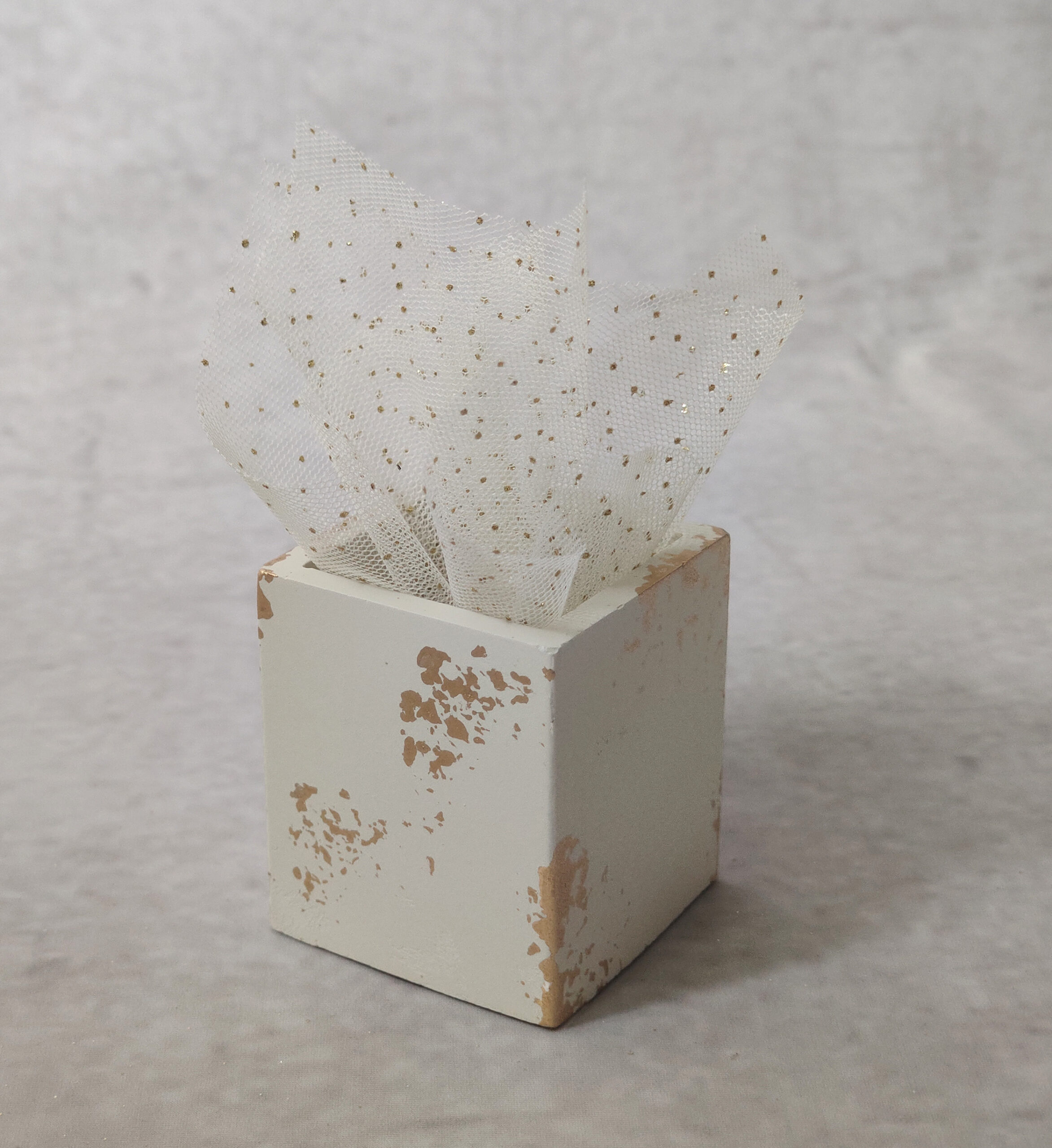 Μπομπονιέρα γάμου τουλίπα σε λευκό χρώμα με χρυσές πιτσιλιές και λευκό γκλίτερ τούλι.
