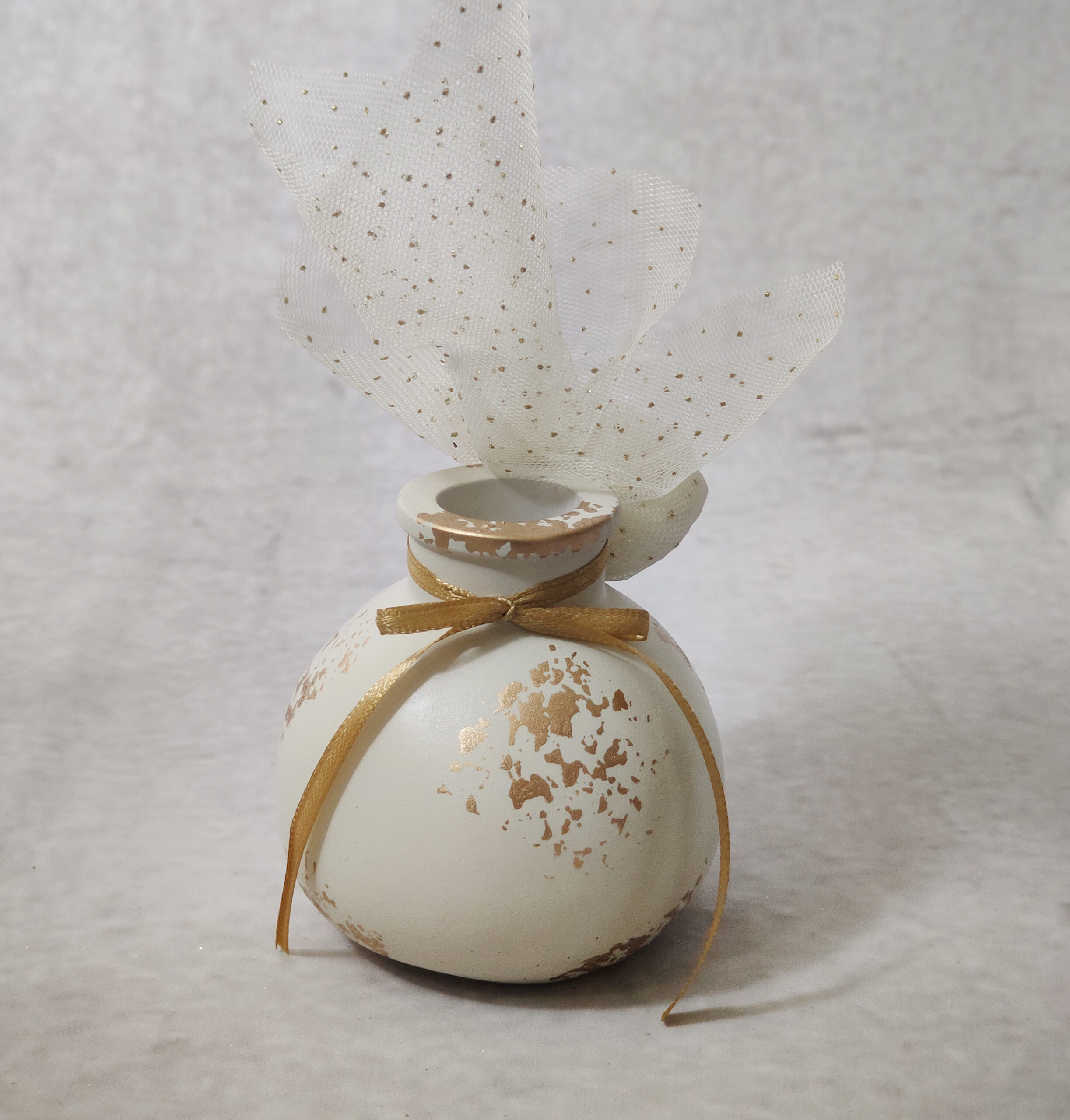 Μπομπονιέρα γάμου κεραμικό ανθοδοχείο σε λευκό χρώμα με χρυσές πιτσιλιές και λευκό γκλίτερ τούλι.