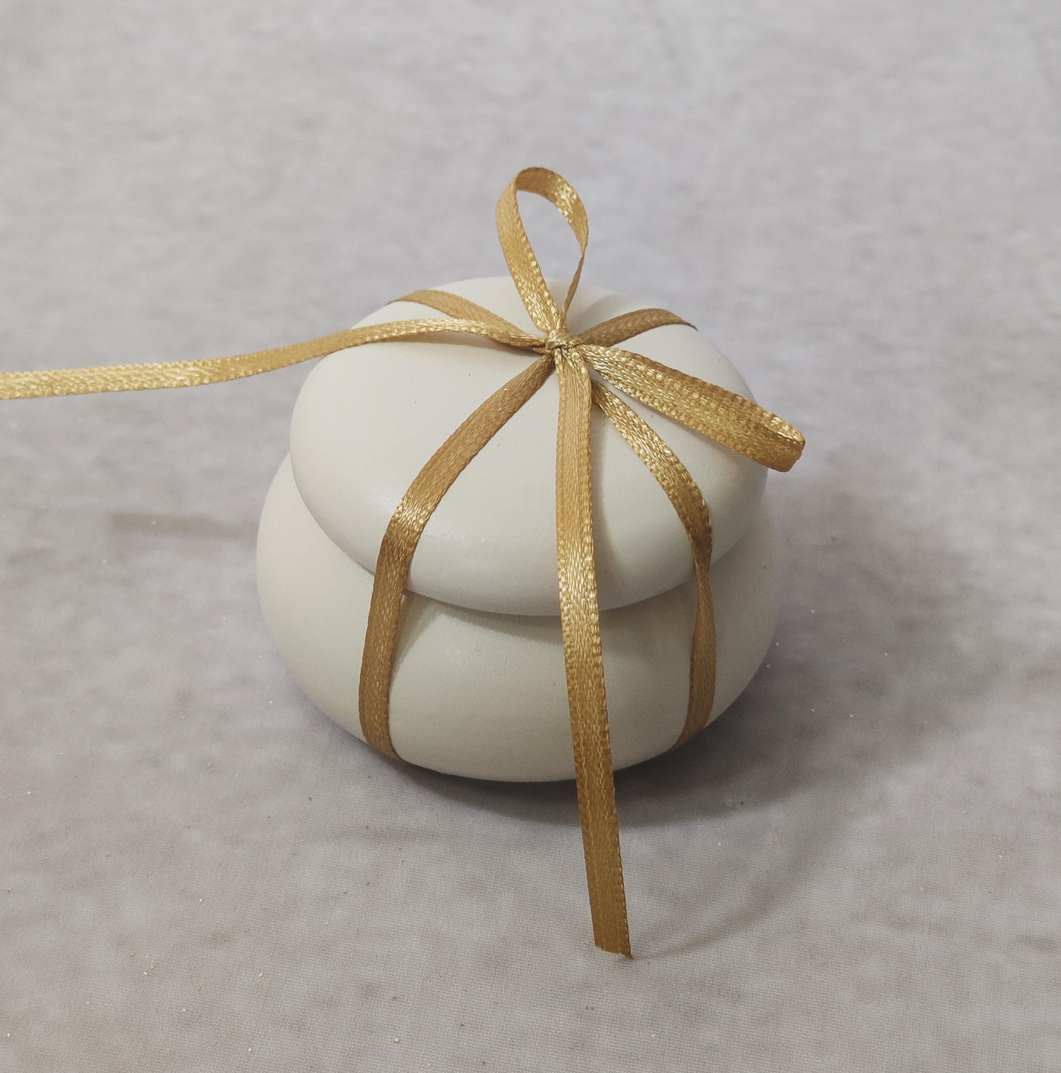 Μπομπονιέρα γάμου μπιζουτιέρα κεραμική σε εκρού χρώμα δεμένη με σατέν κορδέλα.