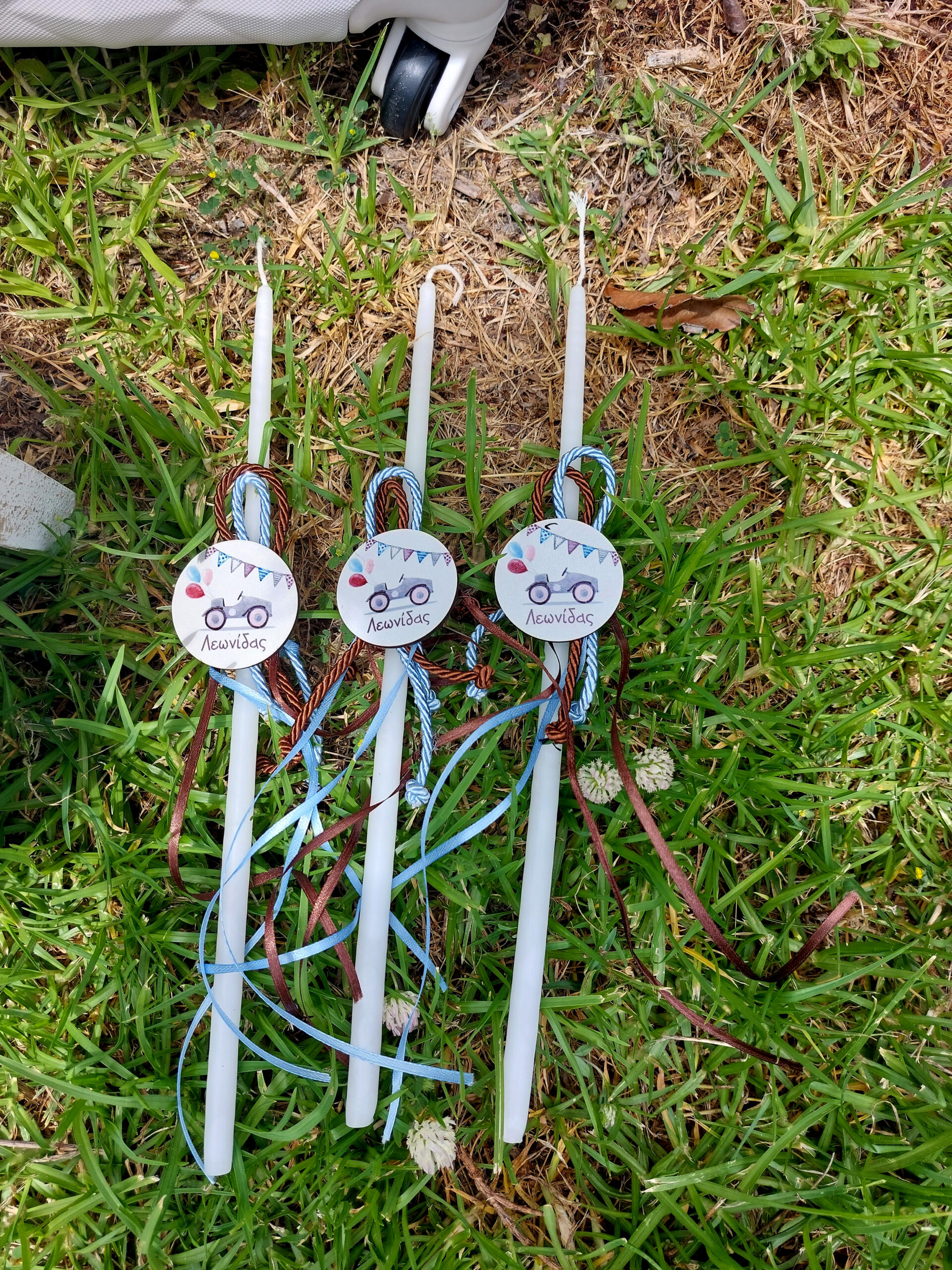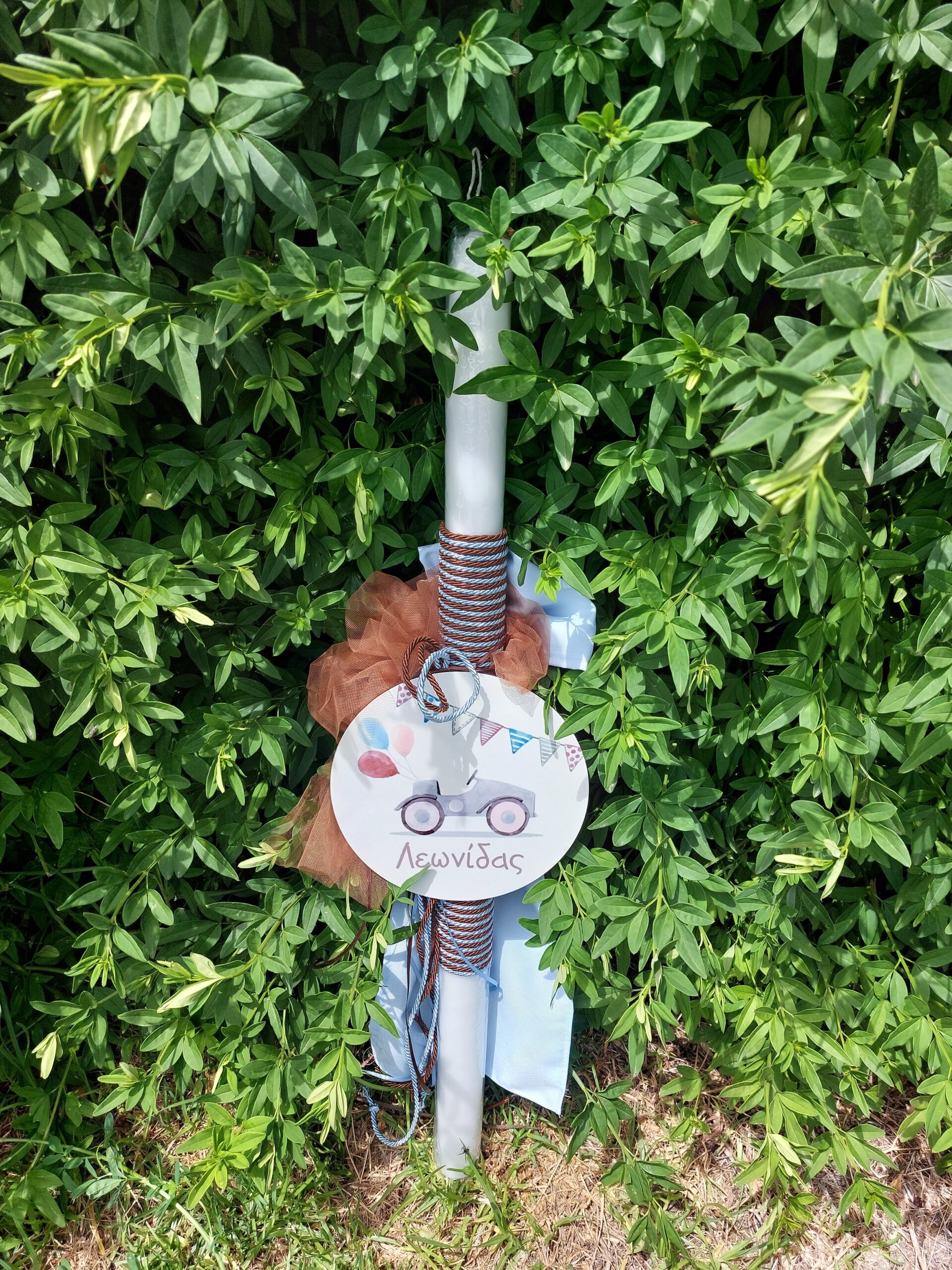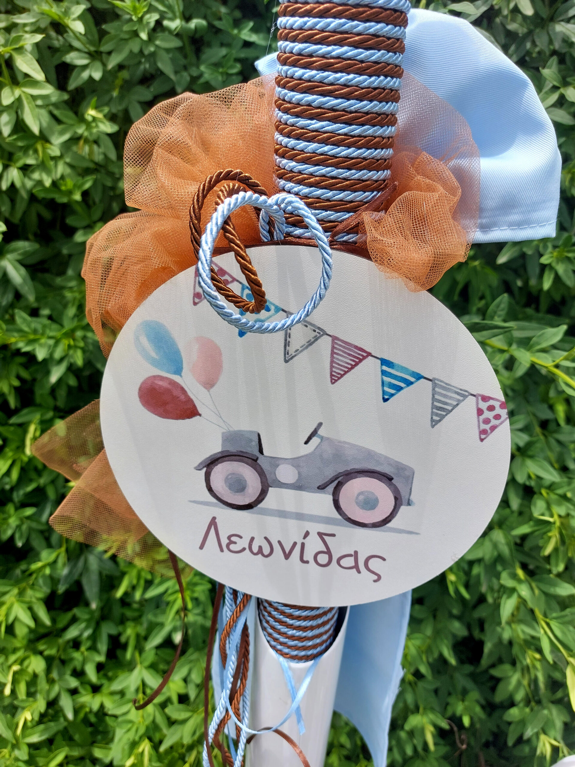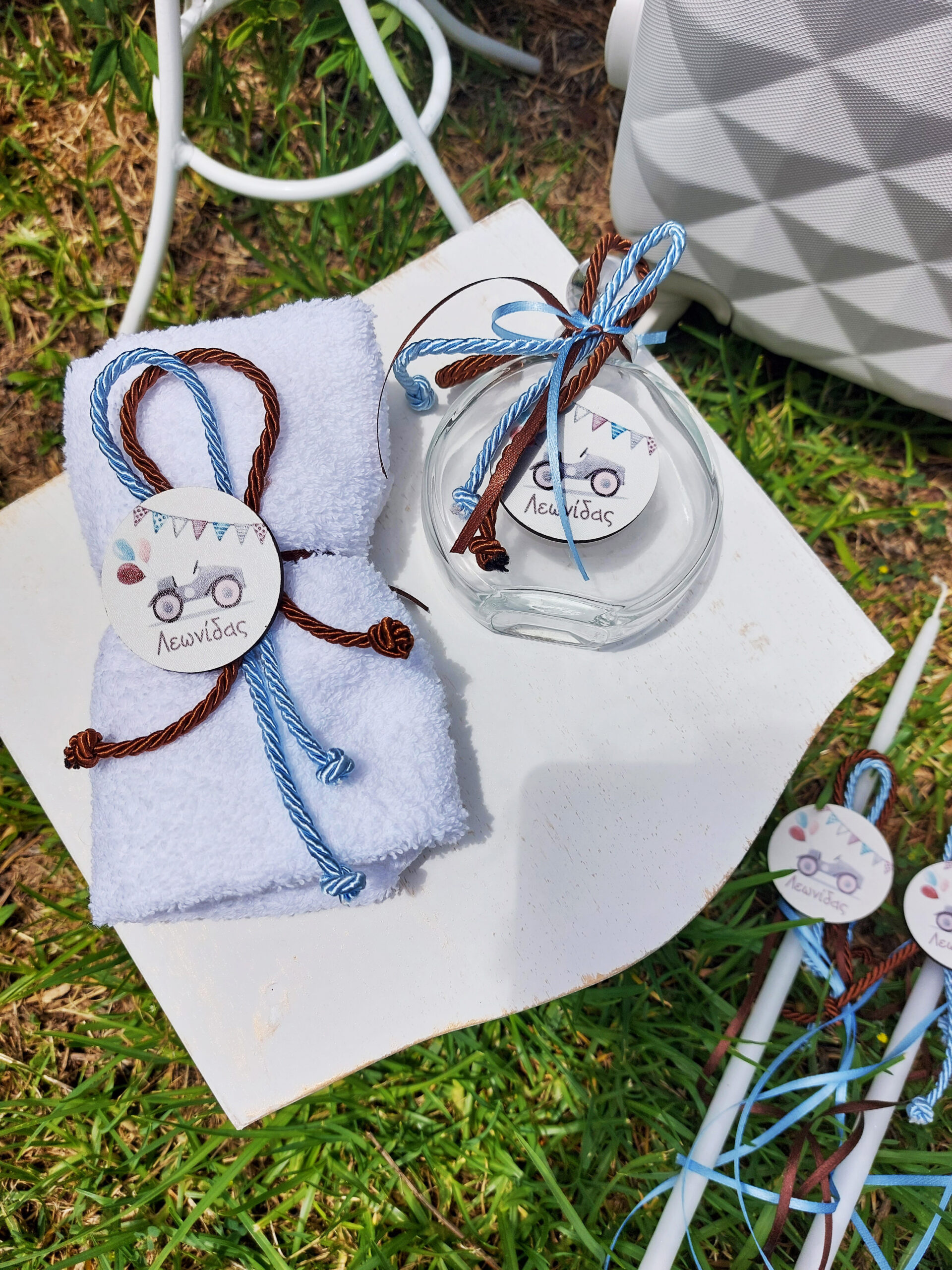 Πακέτο βάπτισης για αγόρι με θέμα αυτοκινητάκι σε καφέ και γαλάζιες αποχρώσεις. Στη λαμπάδα αναφέρεται το όνομα του μωρού ( προαιρετικά) με ξύλινο διακοσμητικο και διακόσμηση από τούλι, σχοινιά και σατεν κορδέλες ενώ στη βαλίτσα αναφέρεται η ημερομηνία της βάπτισης ( προαιρετικά) με ανάλογη διακόσμηση. Το πακέτο της βάπτισης περιλαμβάνει τη λαμπάδα, τη βαλίτσα, το λαδοσέτ (μπουκάλι λαδιού, πετσέτα ιερέα και σαπούνι) καθώς και 3 λαμπαδάκια για την κολυμπήθρα, όλα στολισμένα με ξύλινα διακοσμητικά στο ίδιο θέμα.
