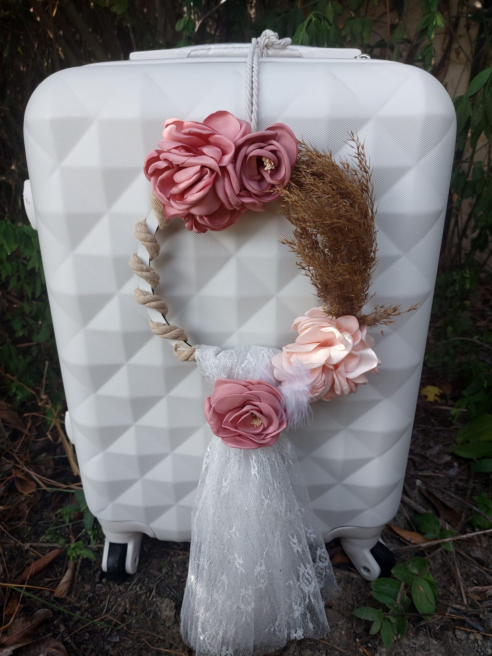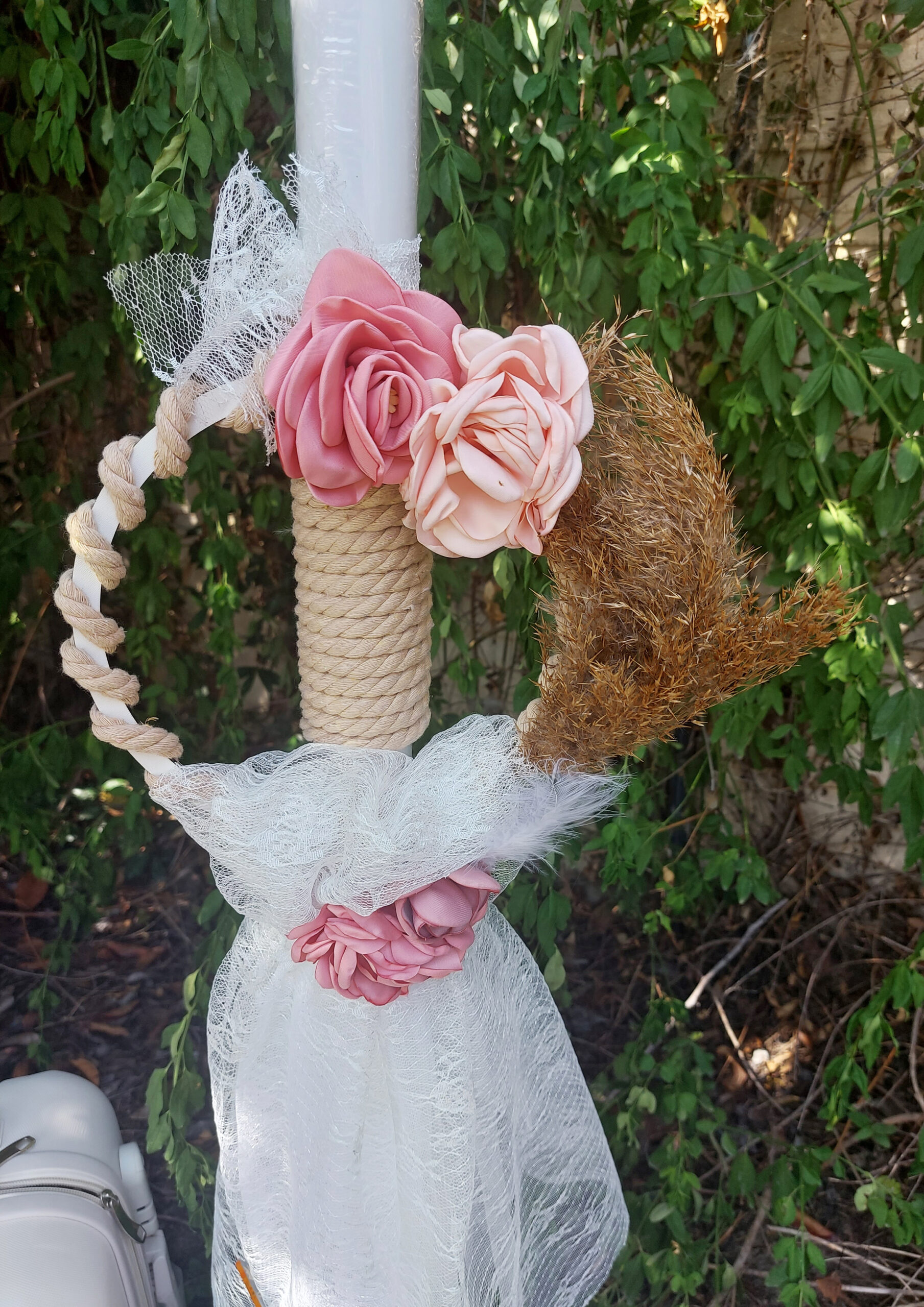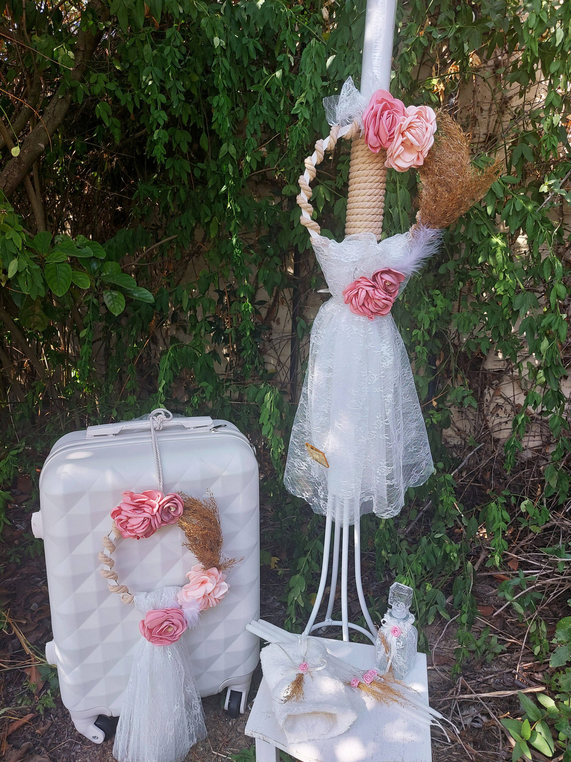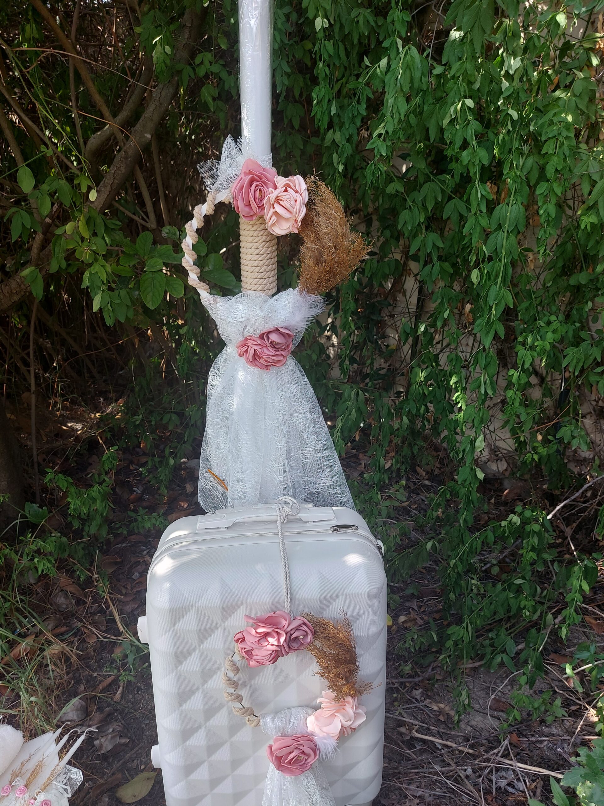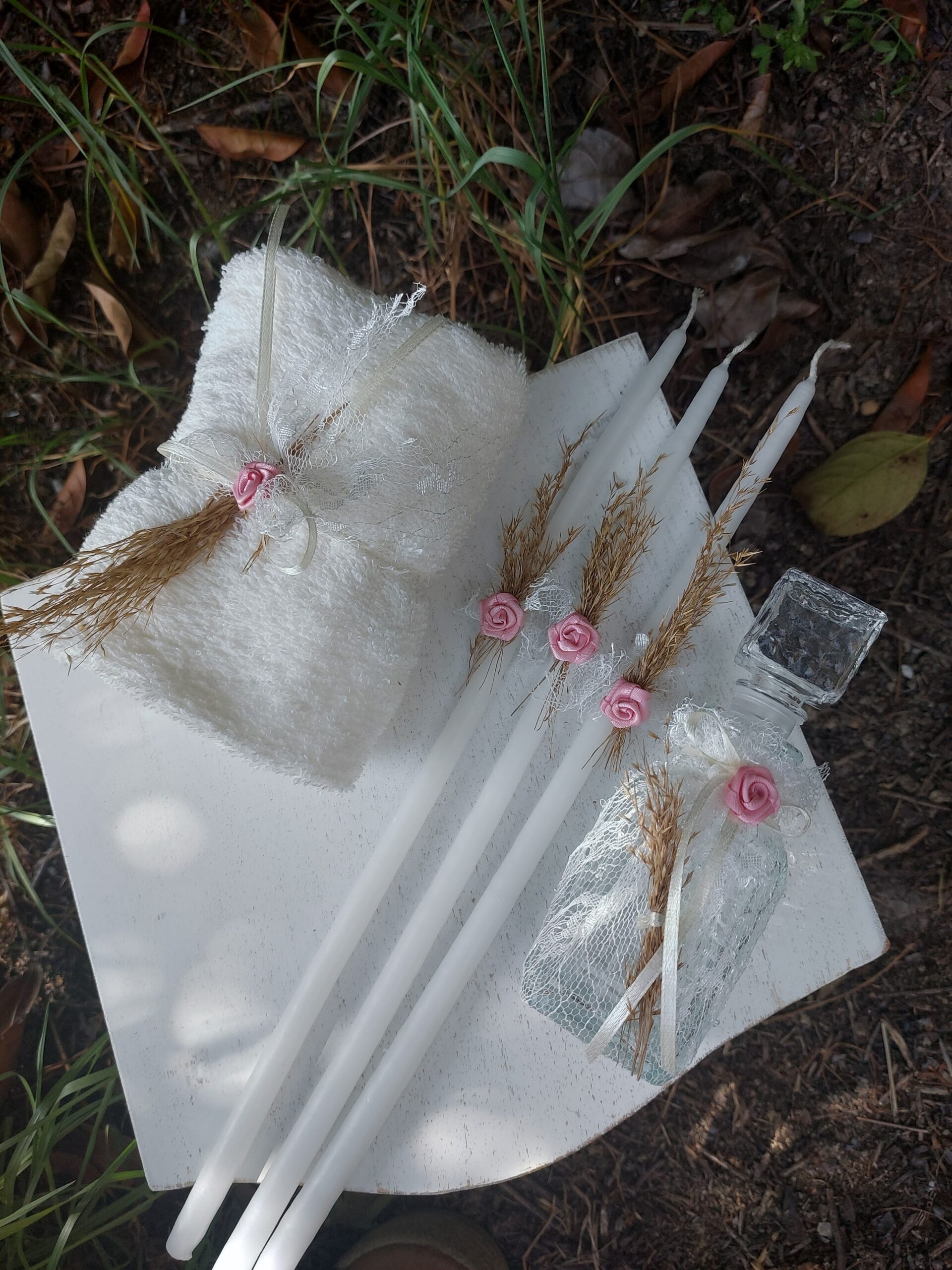 Πακέτο βάπτισης για κορίτσι σε λευκές και ροζ αποχρώσεις, με στεφάνι διακοσμημένο από υφασμάτινα λουλούδια, σχοινιά, πάμπας, φτερά και πλούσια διακόσμηση από λευκή δαντέλα. Περιλαμβάνει τη λαμπάδα, το ξύλινο θρανίο – κουτί, το λαδοσέτ (μπουκάλι λαδιού, πετσέτα ιερέα και σαπούνι) καθώς και 3 λαμπαδάκια για την κολυμπήθρα.