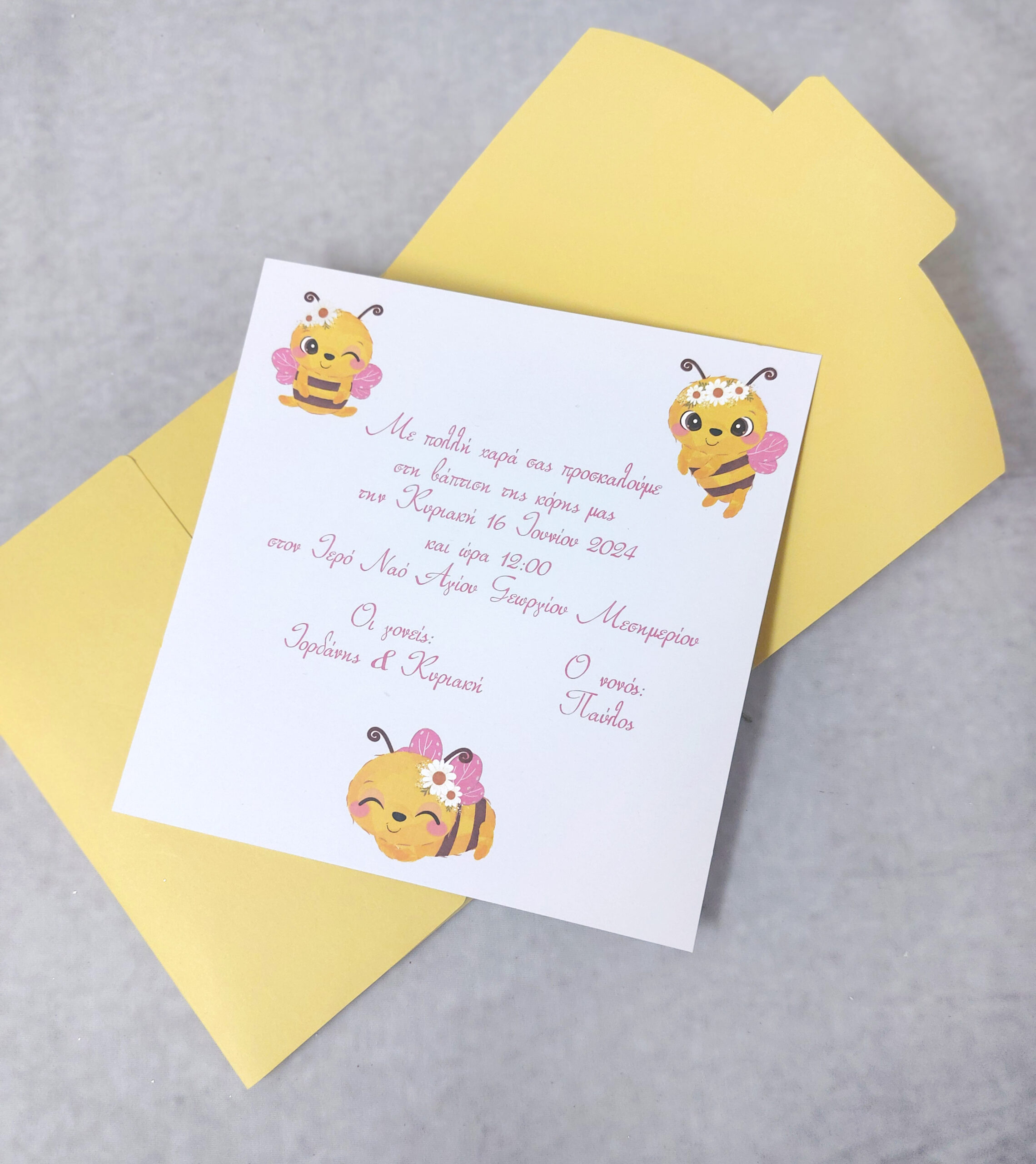 Προσκλητήριο βάπτισης με θέμα μέλισσα και κίτρινο φάκελο κουτάκι.