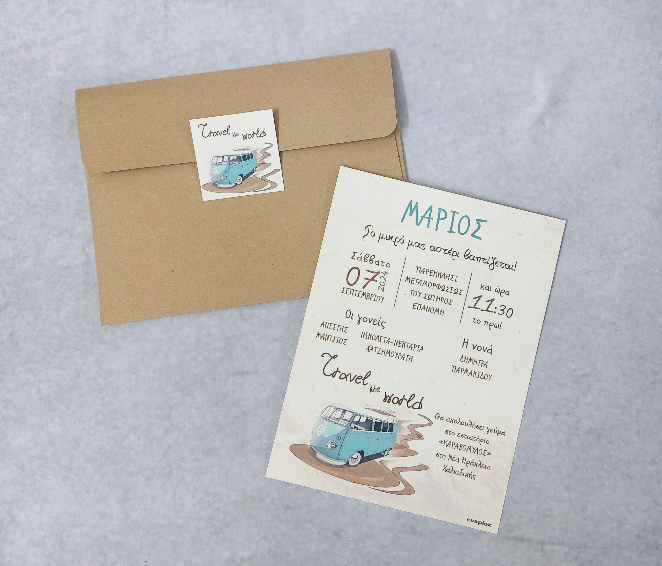 Προσκλητήριο βάπτισης με θέμα “Travel the World” και εκρού φάκελο.
