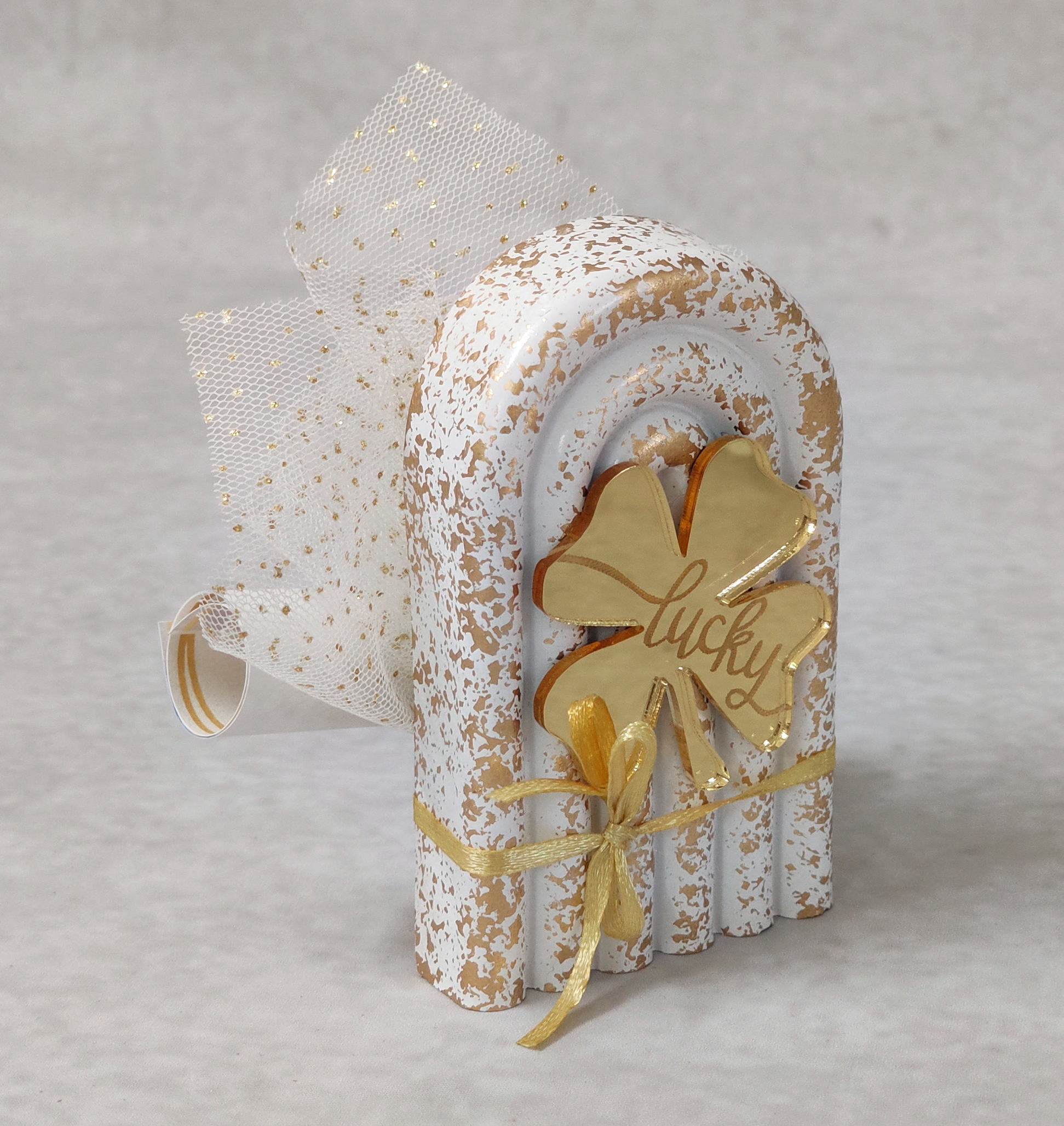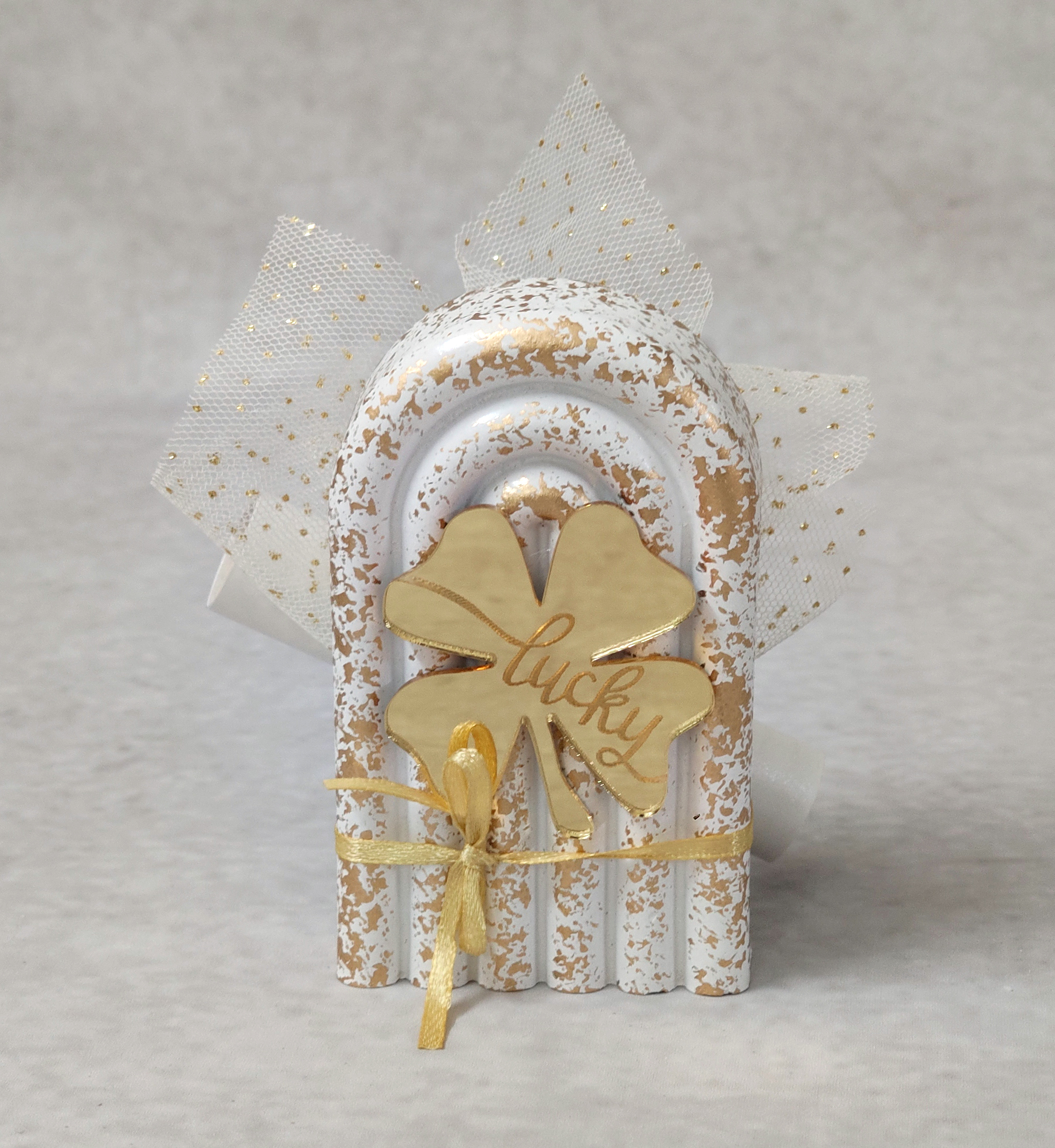 Προσκλητήριο – μπομπονιέρα βάπτισης κεραμικό διακοσμητικό ουράνιο τόξο σε λευκό και χρυσό χρώμα με τριφύλλι ‘Lucky’ από χρυσό καθρέφτη plexi glass δεμένη με χρυσή σατέν κορδέλα, λευκό τούλι με χρυσό glitter και 7 κουφέτα smarties.