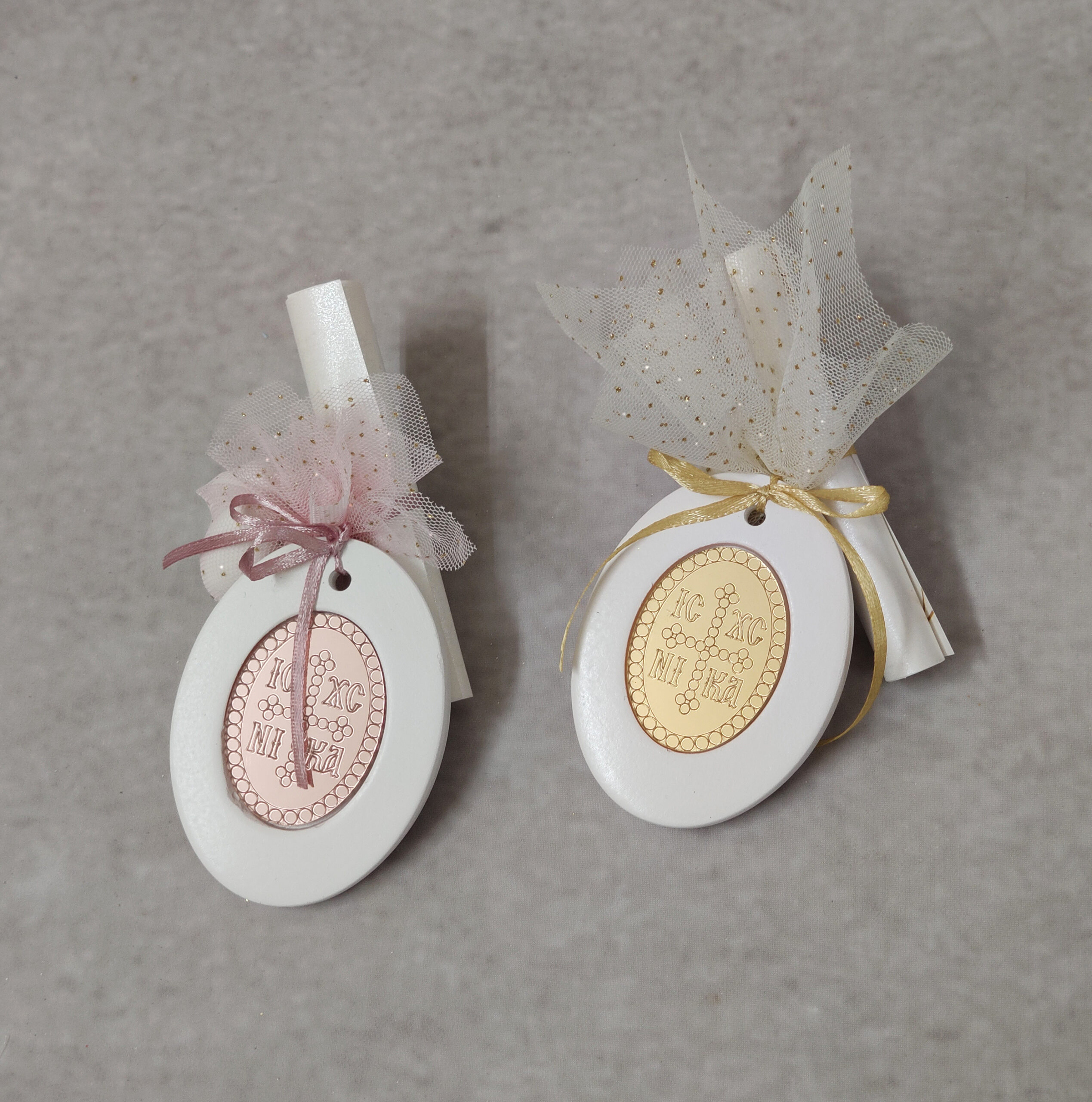 Προσκλητήριο – μπομπονιέρα γάμου – βάπτισης κεραμικό χωνευτό με κωνσταντινάτο από χρυσό καθρέφτη plexi glass.