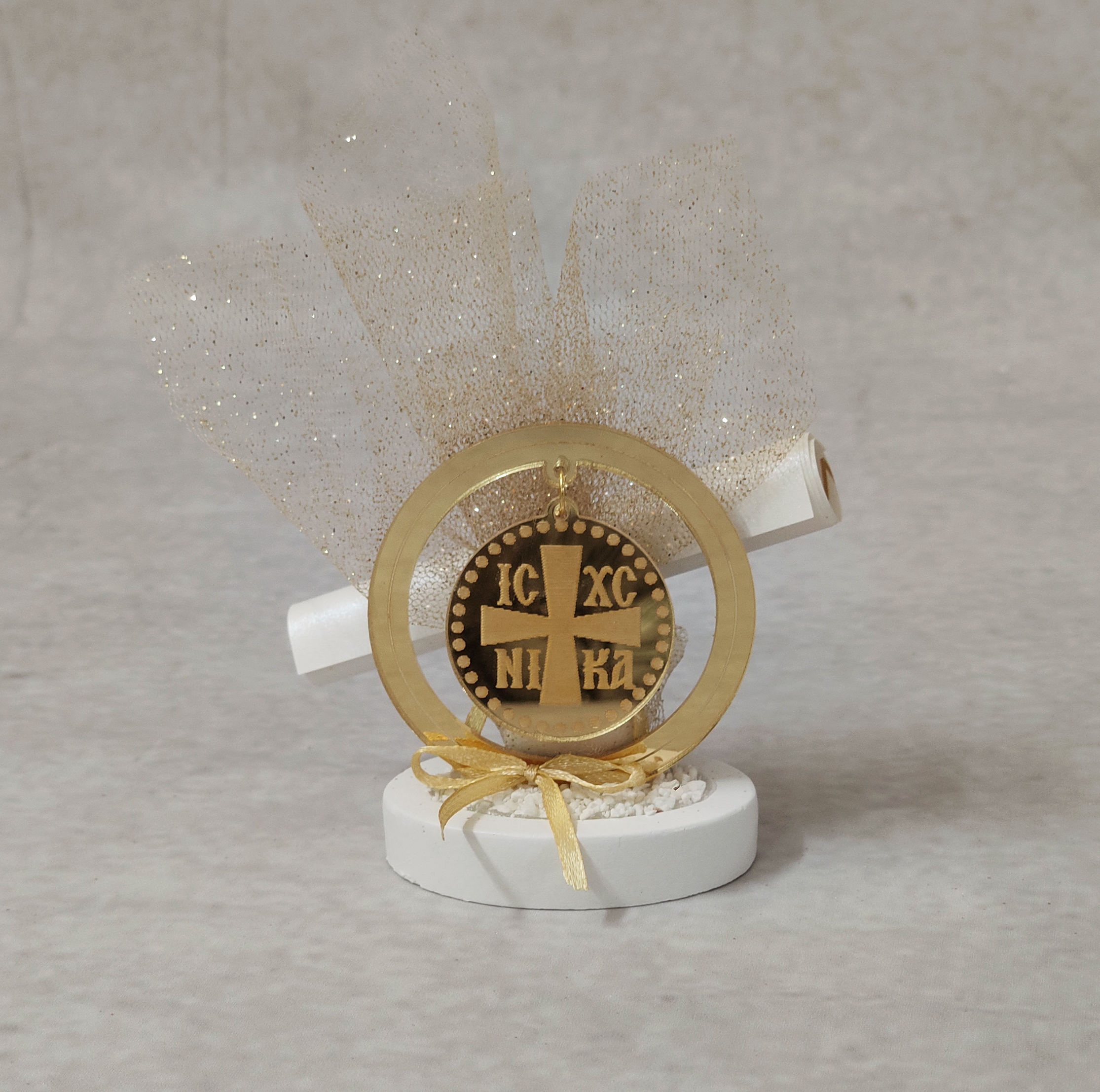 Προσκλητήριο μπομπονιέρα γάμου – βάπτισης κωνσταντινάτο από χρυσό καθρέφτη plexi-glass σε βότσαλο.