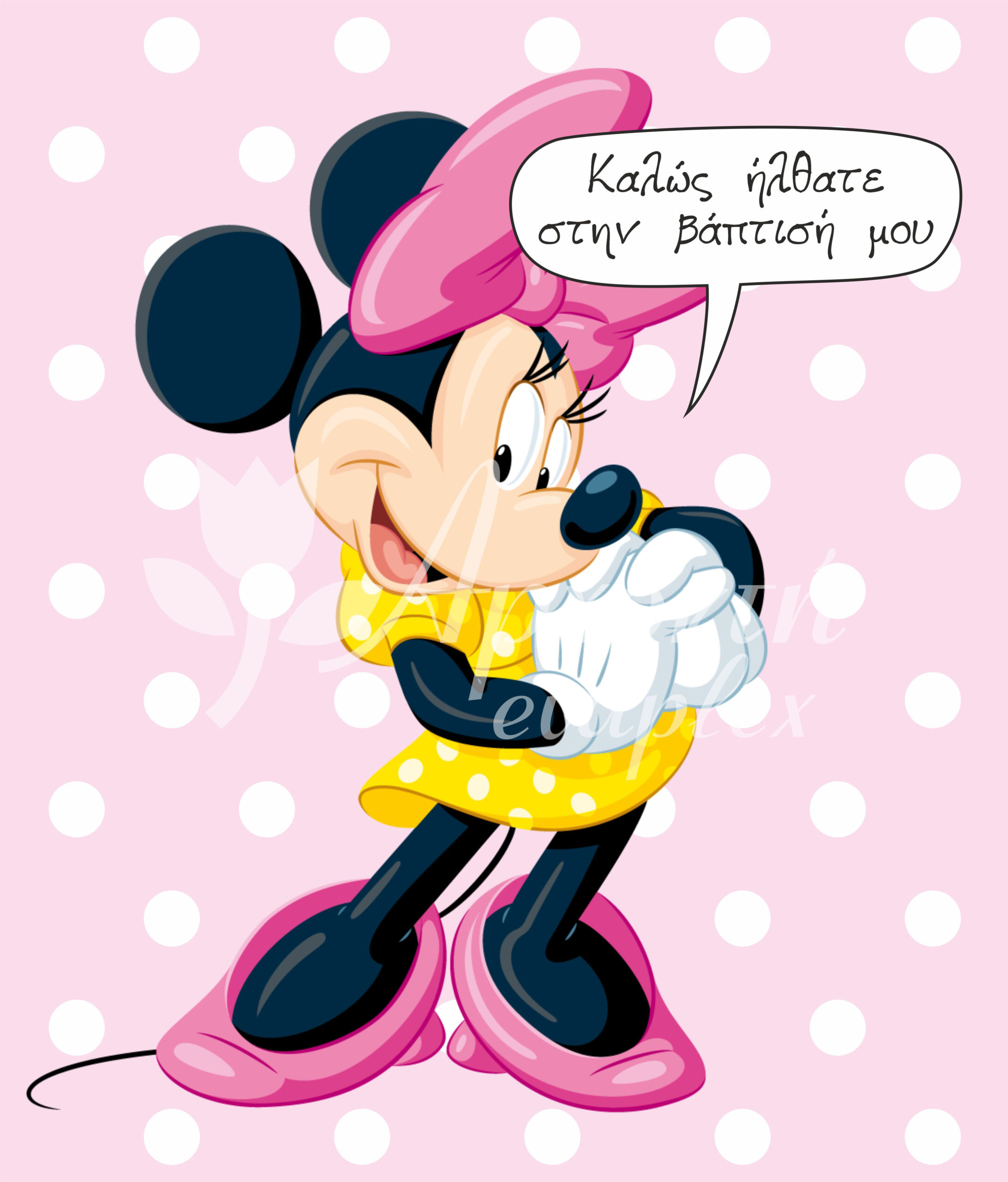 Σατέν υφασμάτινη αφίσα για στολισμό βάπτισης με θέμα Minnie Mouse, σε διάσταση 140 x 190 cm.