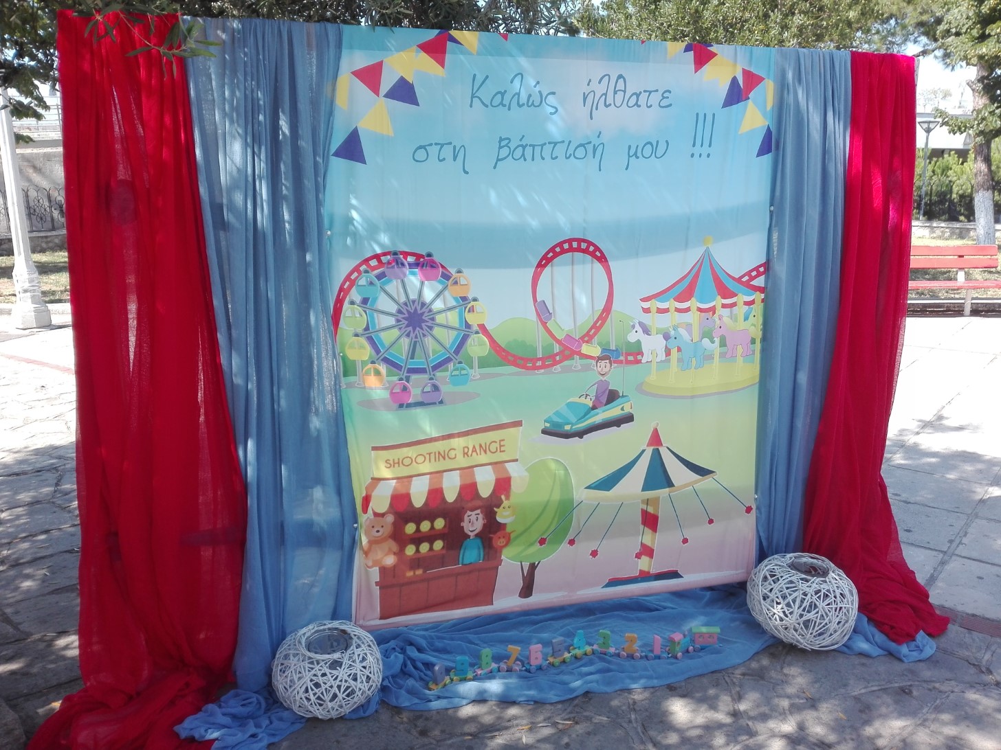 Σατέν υφασμάτινη αφίσα για στολισμό βάπτισης με θέμα λούνα παρκ, σε διάσταση 140 x 190 cm.