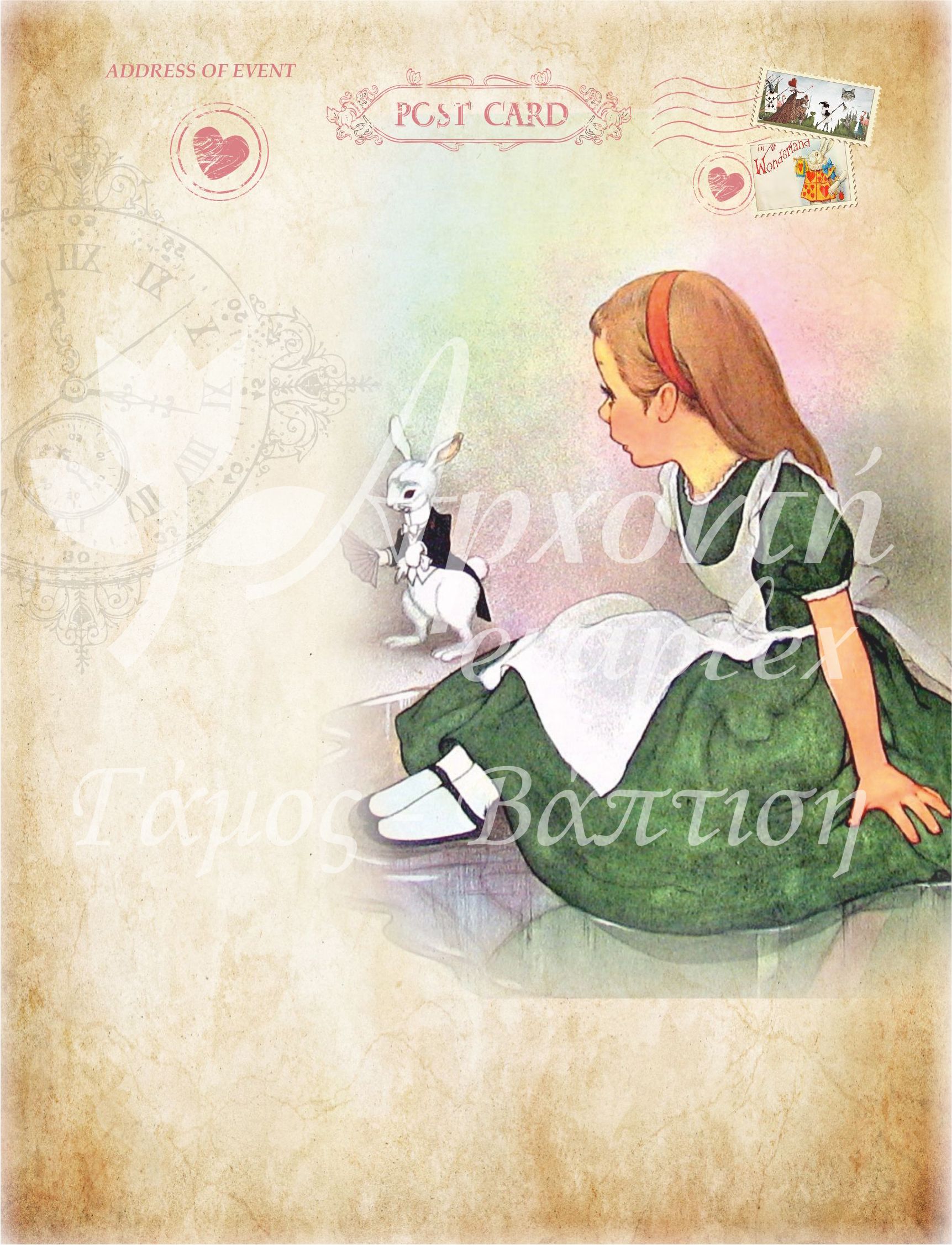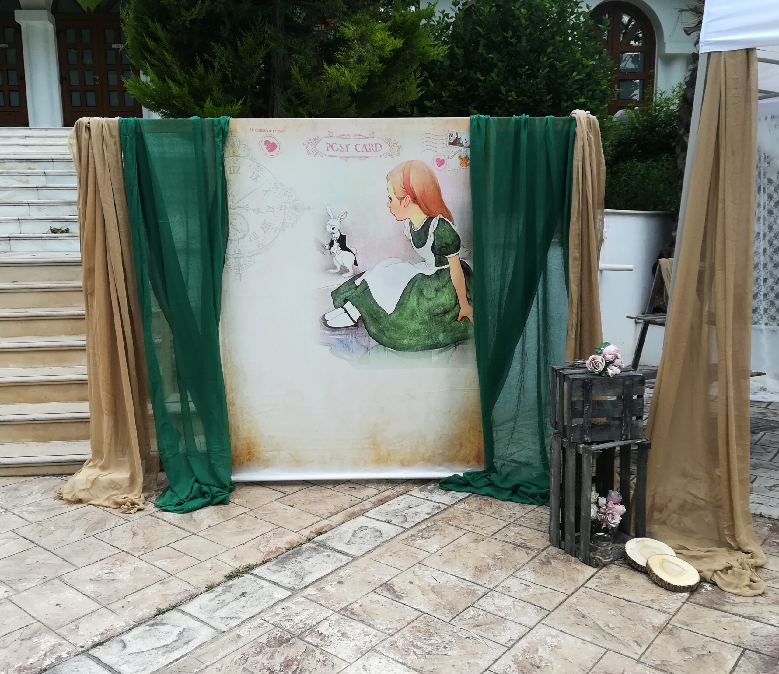 Σατέν υφασμάτινη αφίσα για στολισμό βάπτισης με θέμα Αλίκη στη Χώρα των Θαυμάτων, σε διάσταση 140 x 190 cm.