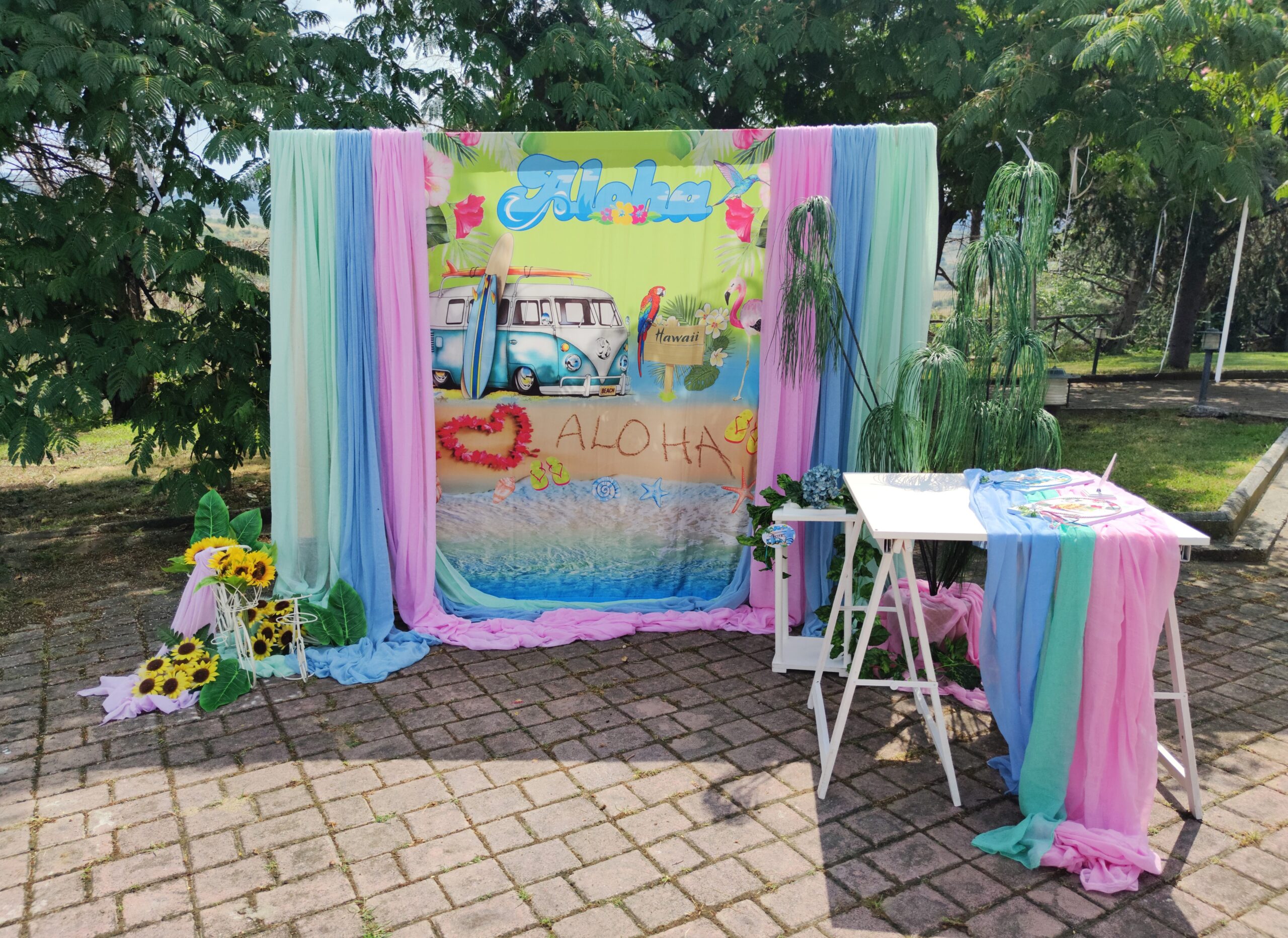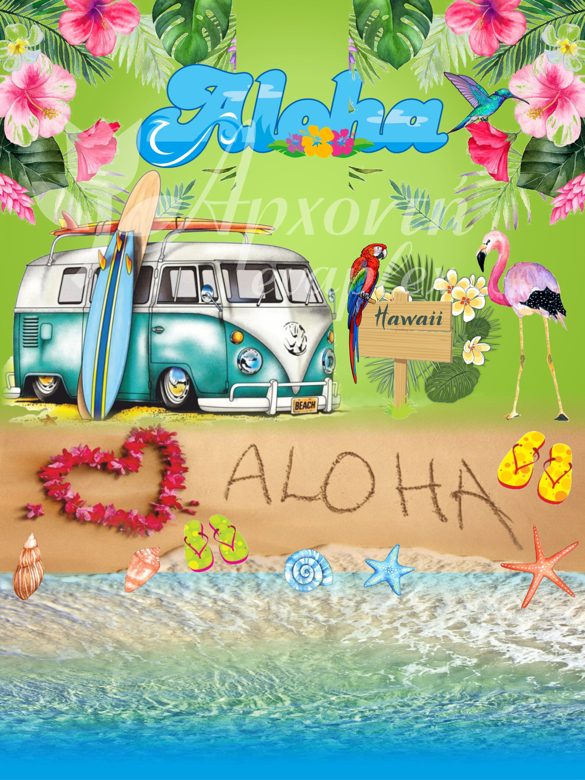 Σατέν υφασμάτινη αφίσα για στολισμό βάπτισης με θέμα Aloha, σε διάσταση 140 x 190 cm.