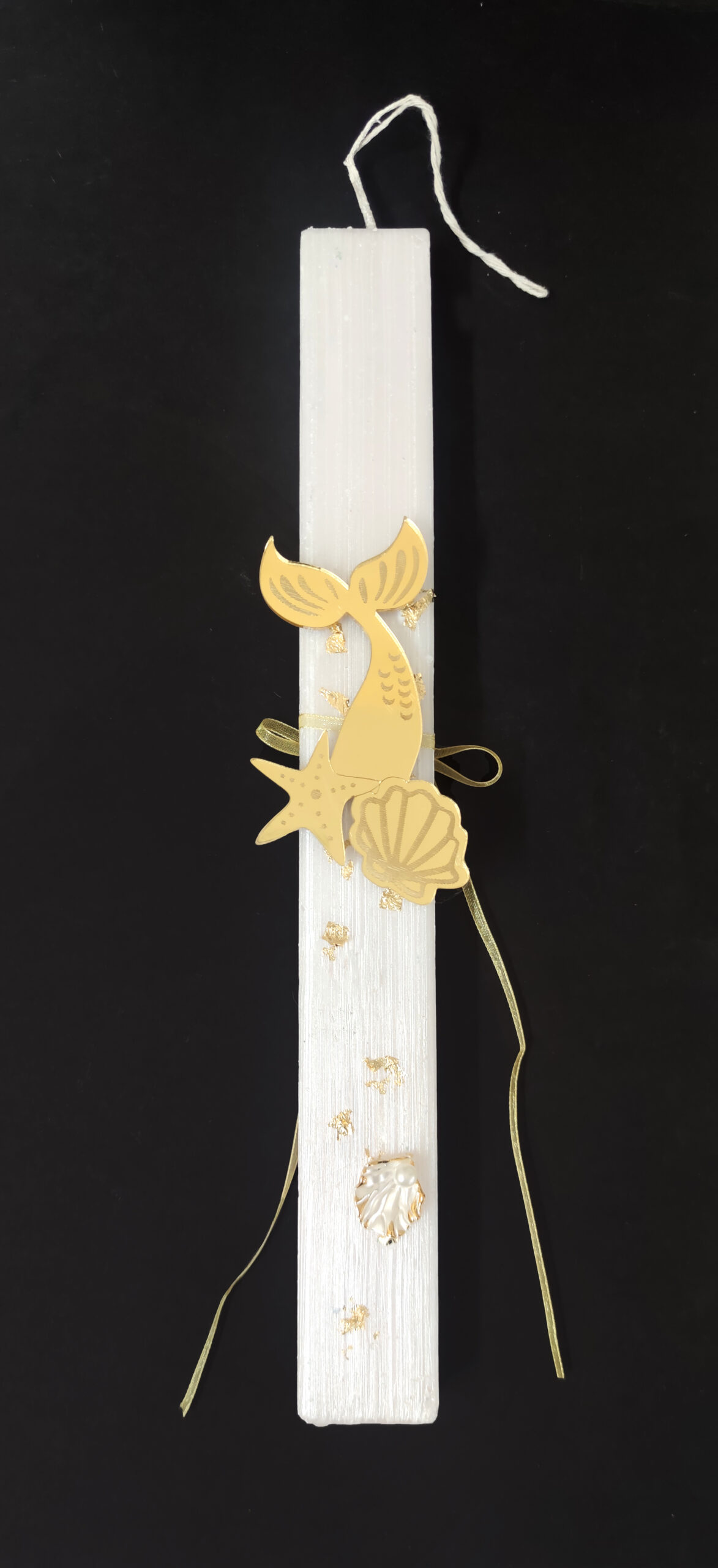 Χειροποίητη πασχαλινή λαμπάδα διακοσμημένη με ουρά από plexiglass, φύλλα χρυσού και κοχύλι και πέρλα.
