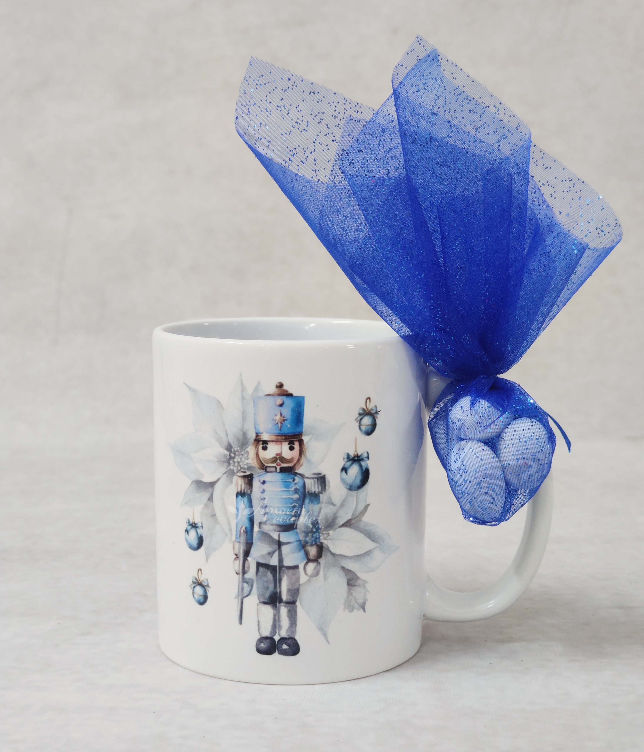 Χριστουγεννιάτικη μπομπονιέρα βάπτισης εκτυπωμένη κούπα βάπτισης με θέμα καρυοθραύστης. για αγόρι, δεμένη με μπλε γκλίτερ τούλι, σατέν κορδέλα και 7 κουφέτα smarties στο χερούλι.