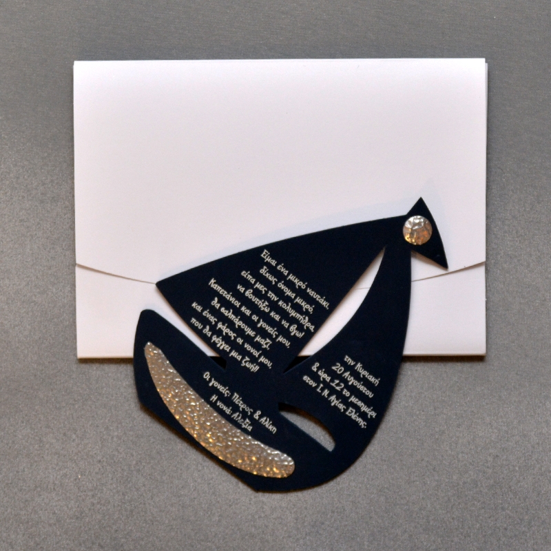 Ξεχωριστό προσκλητήριο βάπτισης καράβι από το πατενταρισμένο αφρώδες υλικό EVA foam, διακοσμημένο με σφυρήλατο μέταλλο, με εκτύπωση μεταξοτυπίας, σε λευκό φάκελο – κουτί.