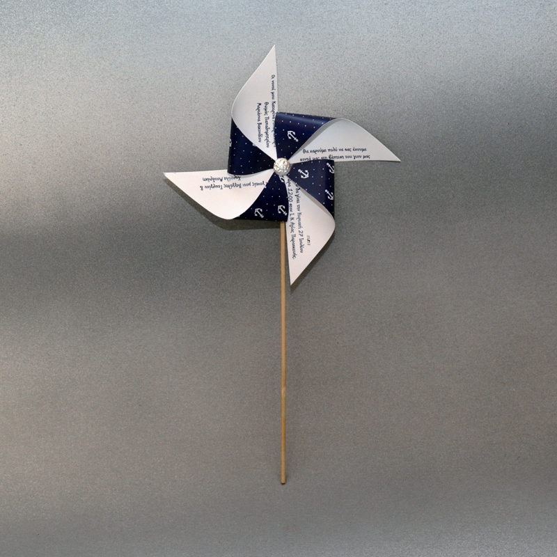 Τρισδιάστατο προσκλητήριο βάπτισης ανεμόμυλος με ναυτικό θέμα, με ξύλινο στικ και μεταλλικό σφυρήλατο στοιχείο.