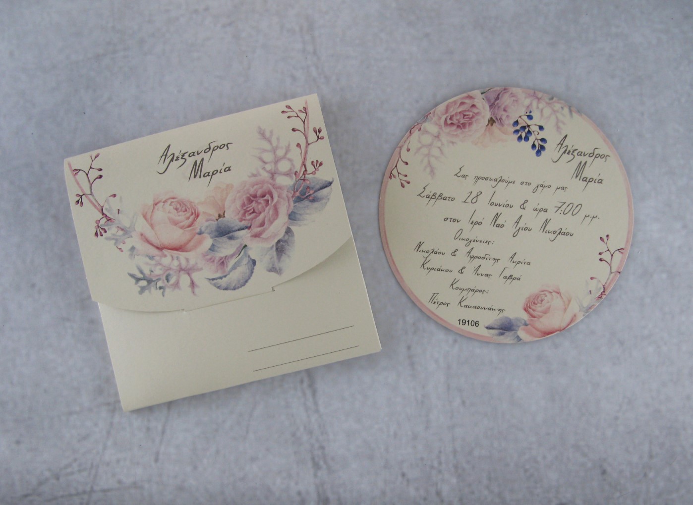 Προσκλητήριο γάμου floral με στρόγγυλη κάρτα και εκτυπωμένο φάκελο – κουτί.