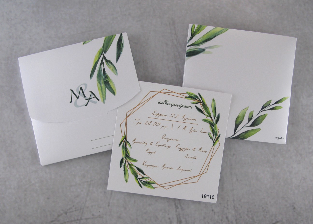 Προσκλητήριο γάμου με γεωμετρικά σχήματα και ελιά σε περλέ χαρτί και εκτυπωμένος φάκελος – κουτί.