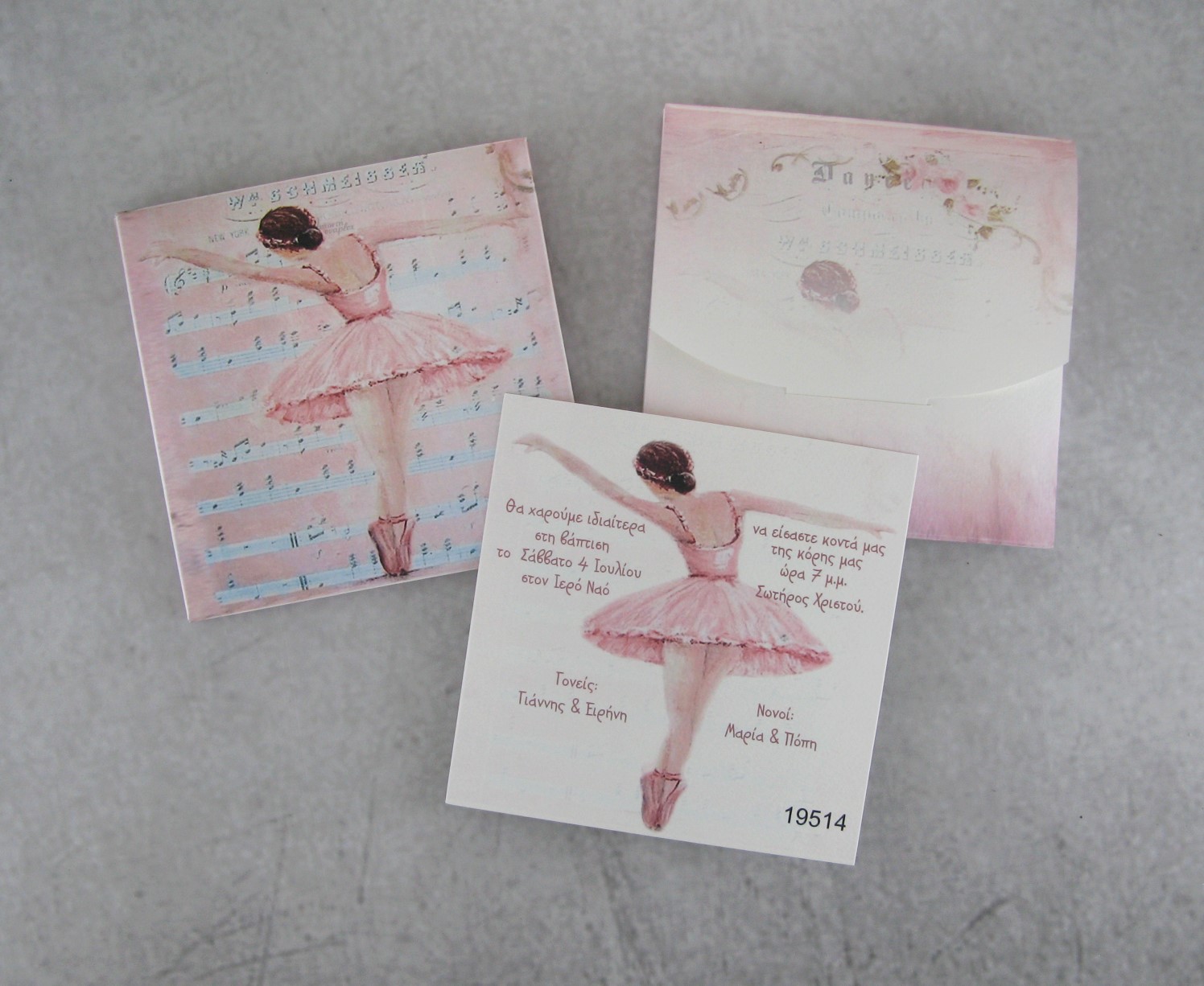 Προσκλητήριο βάπτισης με θέμα μπαλαρίνα και εκτυπωμένος φάκελος - κουτί.