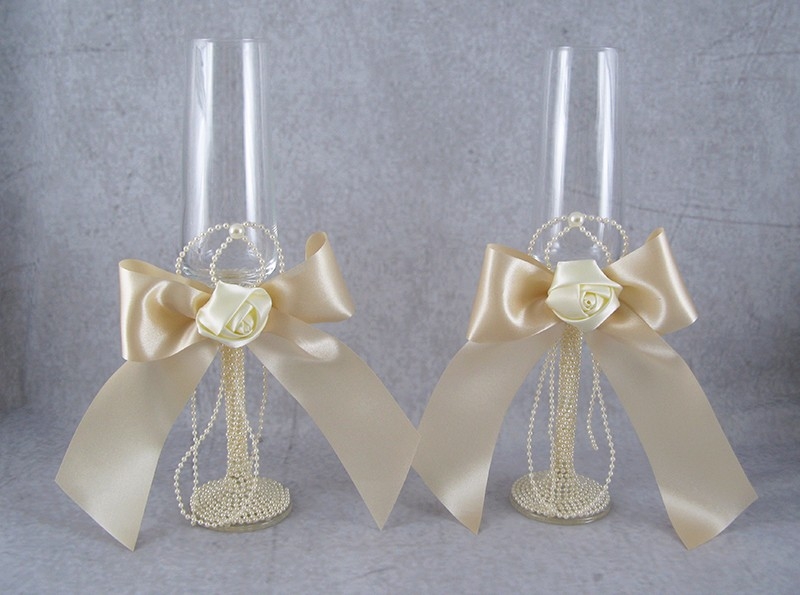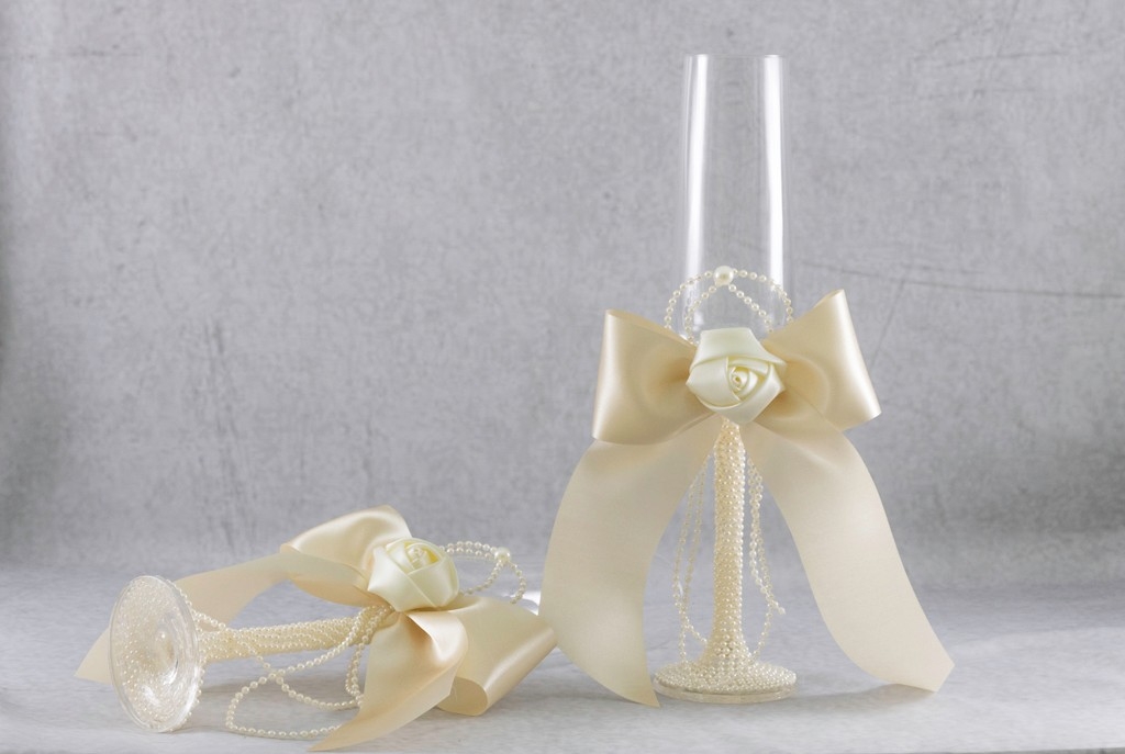 Κρυστάλλινα ποτήρια σαμπάνιας με τρέσα από πέρλες στη βάση, σατέν τριαντάφυλλα και φιόγκο.