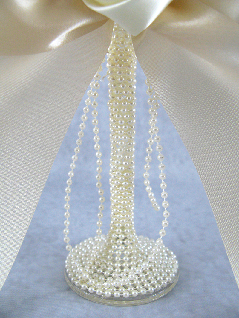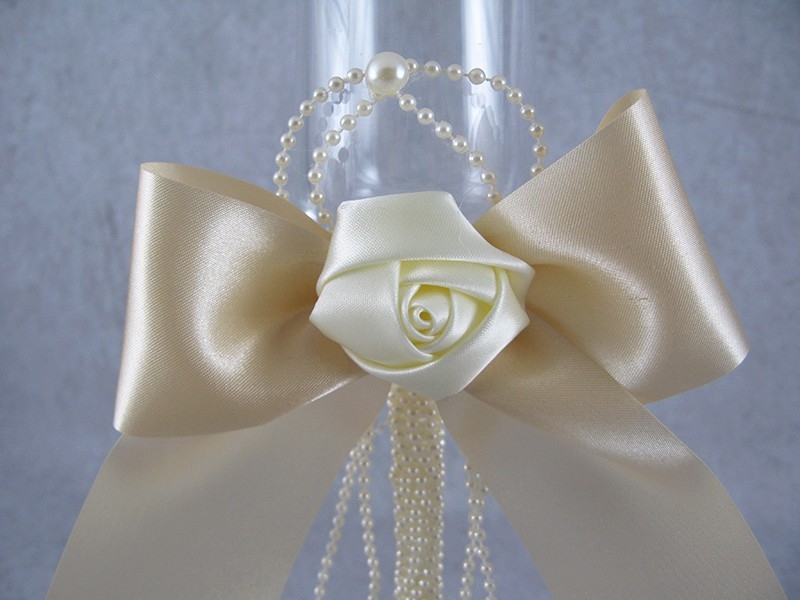 Εντυπωσιακά κρυστάλλινα ποτήρια σαμπάνιας, διακοσμημένα με τρέσα από πέρλες στη βάση, σατέν τριαντάφυλλα και σατέν εκρού φιόγκο. Σετ των 2 τεμαχίων.
