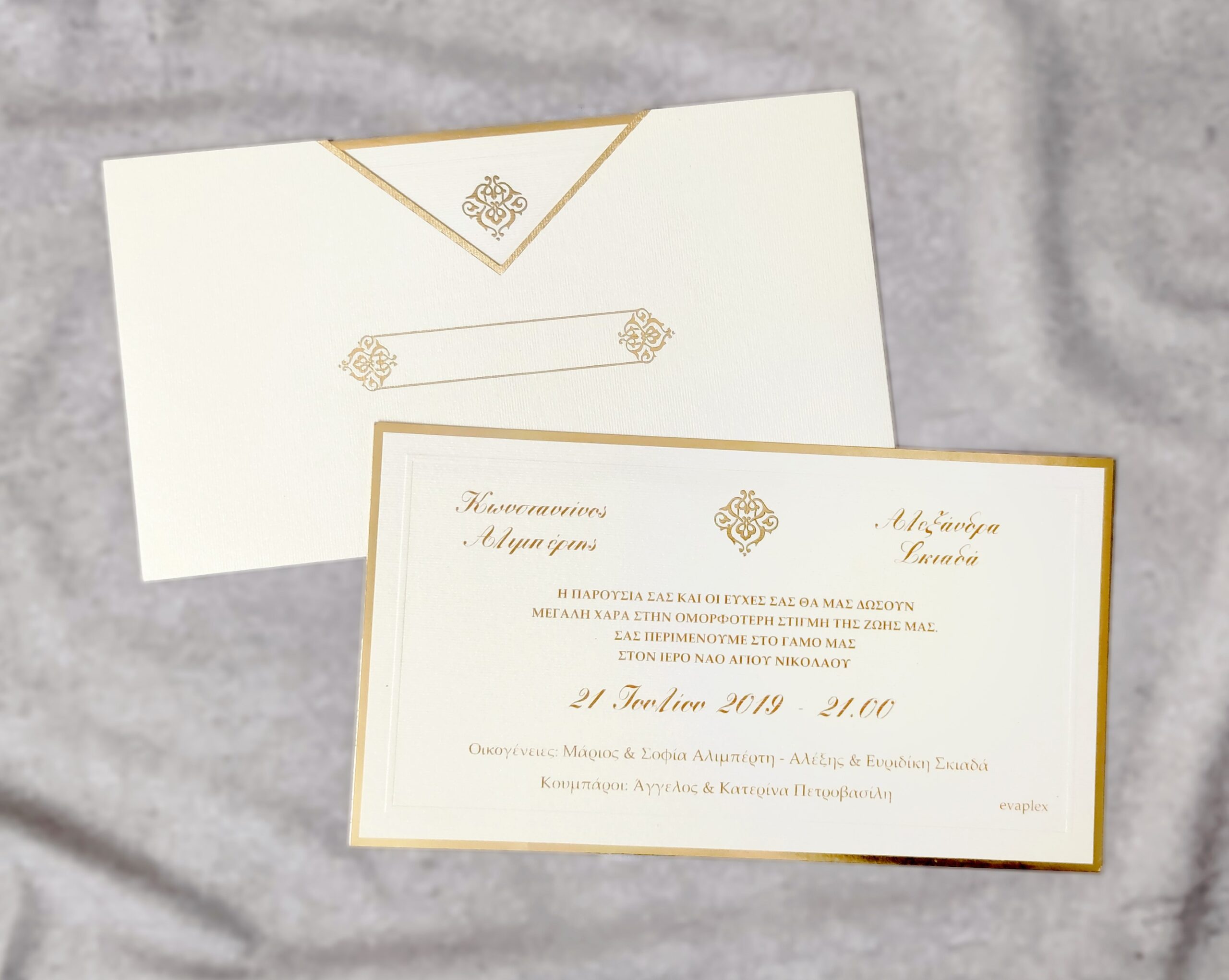 Προσκλητήριο γάμου με ανάγλυφότητα, χρυσοτυπίες και ιδιαίτερο κόψιμο φακέλου.
