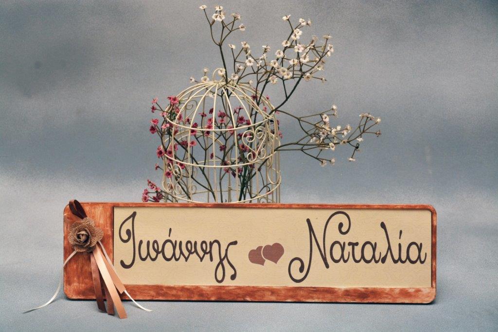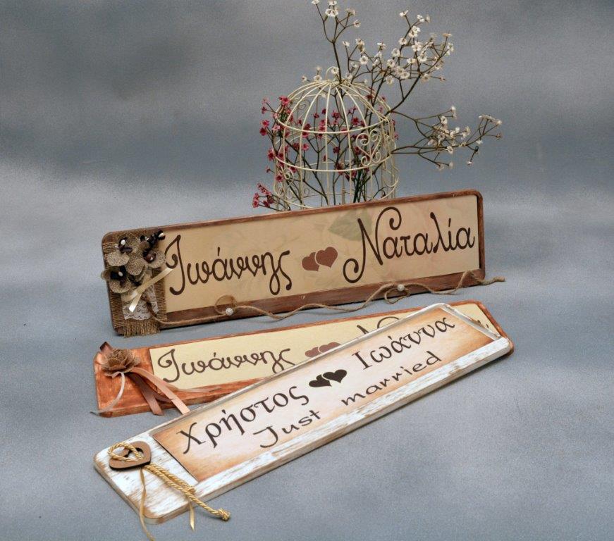 Χειροποίητη πινακίδα αυτοκινήτου με τα ονόματα του ζευγαριού σε vintage στυλ, με τριαντάφυλλο από λινάτσα και σατέν κορδέλες. Η πινακίδα διαθέτει στην πίσω όψη ειδικά αυτοκόλλητα και τοποθετείται εύκολα πάνω στην υπάρχουσα πινακίδα του αυτοκινήτου. Υπάρχει δυνατότητα διακόσμησης της πινακίδας σύμφωνα με την καράφα, το ποτήρι κρασιού ή την μπομπονιέρα κτλ, καθώς και ειδικών κατασκευών, κατόπιν συνεννόησης.