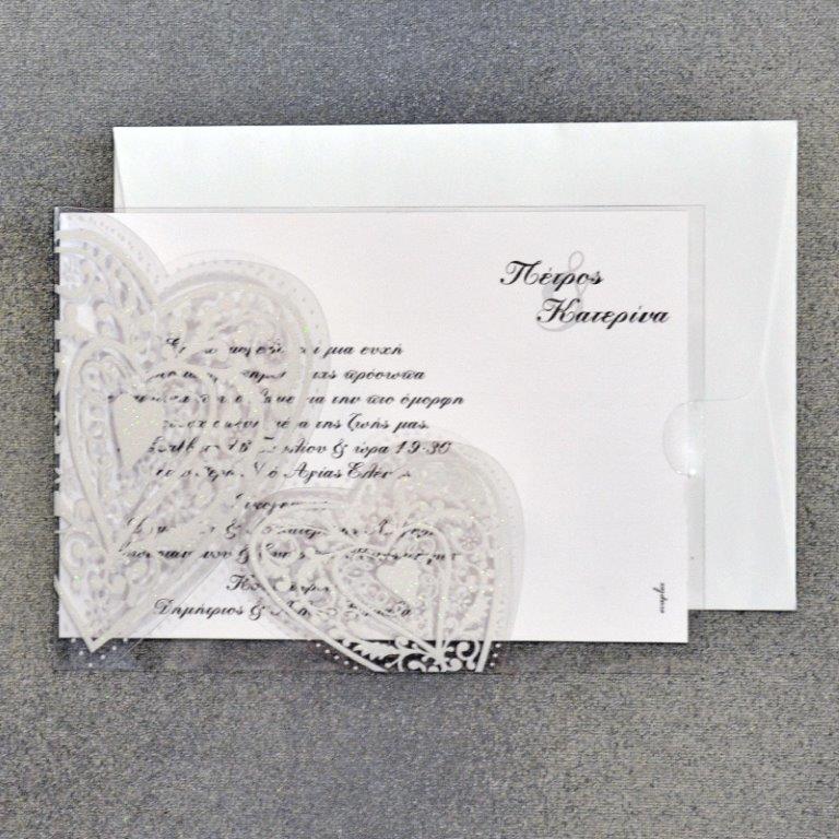 Προσκλητήριο γάμου με διαφάνεια με σχέδιο καρδιές με glitter, ιδιαίτερη κοπή και φάκελο σε λευκό χρώμα.
