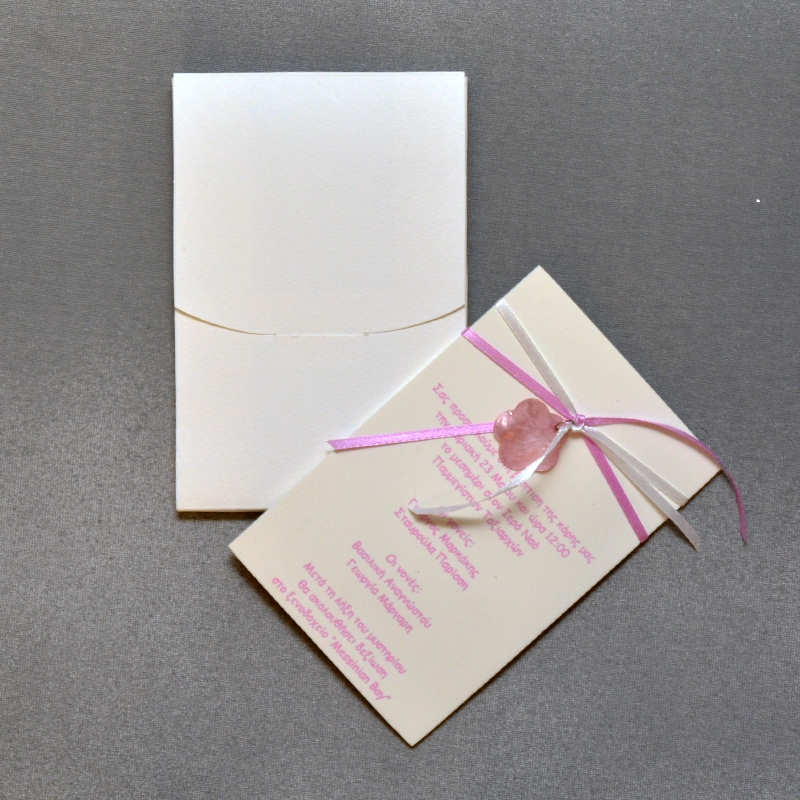 Ξεχωριστό προσκλητήριο βάπτισης από το πατενταρισμένο αφρώδες υλικό EVA foam, με διακόσμηση σατέν κορδέλες και ροζ λουλούδι από φίλντισι, με εκτύπωση μεταξοτυπίας, σε λευκό φάκελο – κουτί.