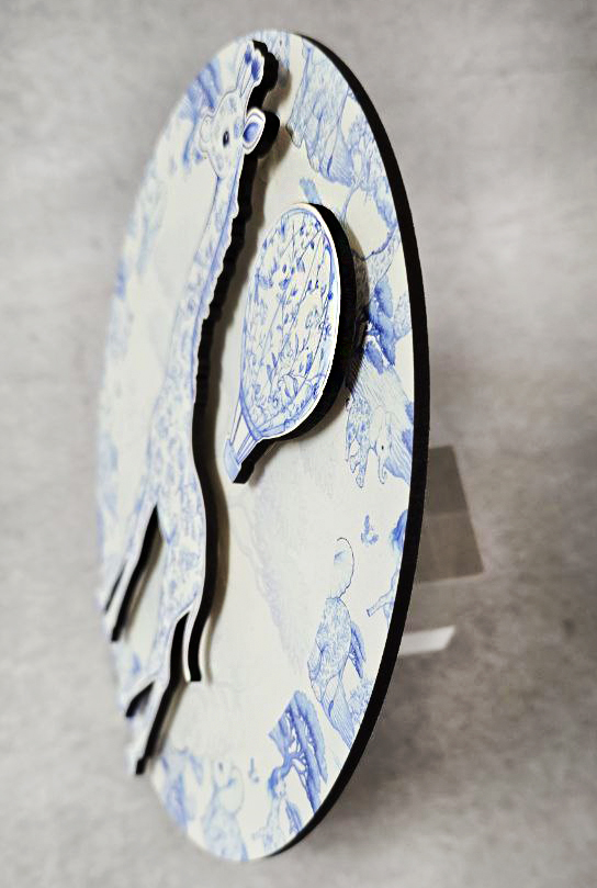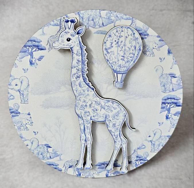 Διακόσμηση βαλίτσας με τρισδιάστατη (3D) ξύλινη εκτύπωση, με καμηλοπάρδαλη ψηλή σε κομψό στυλ Toile de Jouy. Το σχέδιο απεικονίζει μια καμηλοπάρδαλη σε απαλές μπλε αποχρώσεις που χαρίζουν ρομαντική και διαχρονική αισθητική.