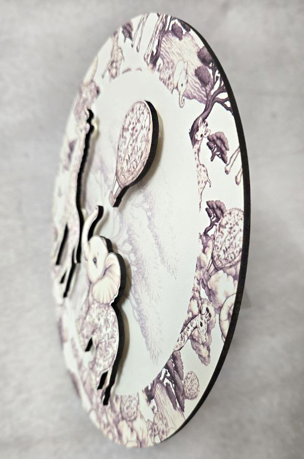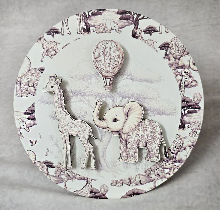 Διακόσμηση βαλίτσας με τρισδιάστατη (3D) ξύλινη εκτύπωση, με σκηνή safari σε κομψό στυλ Toile de Jouy. Το σχέδιο απεικονίζει διάφορα χαριτωμένα ζωάκια της ζούγκλας, σε απαλές καφέ αποχρώσεις που χαρίζουν ρομαντική και διαχρονική αισθητική.