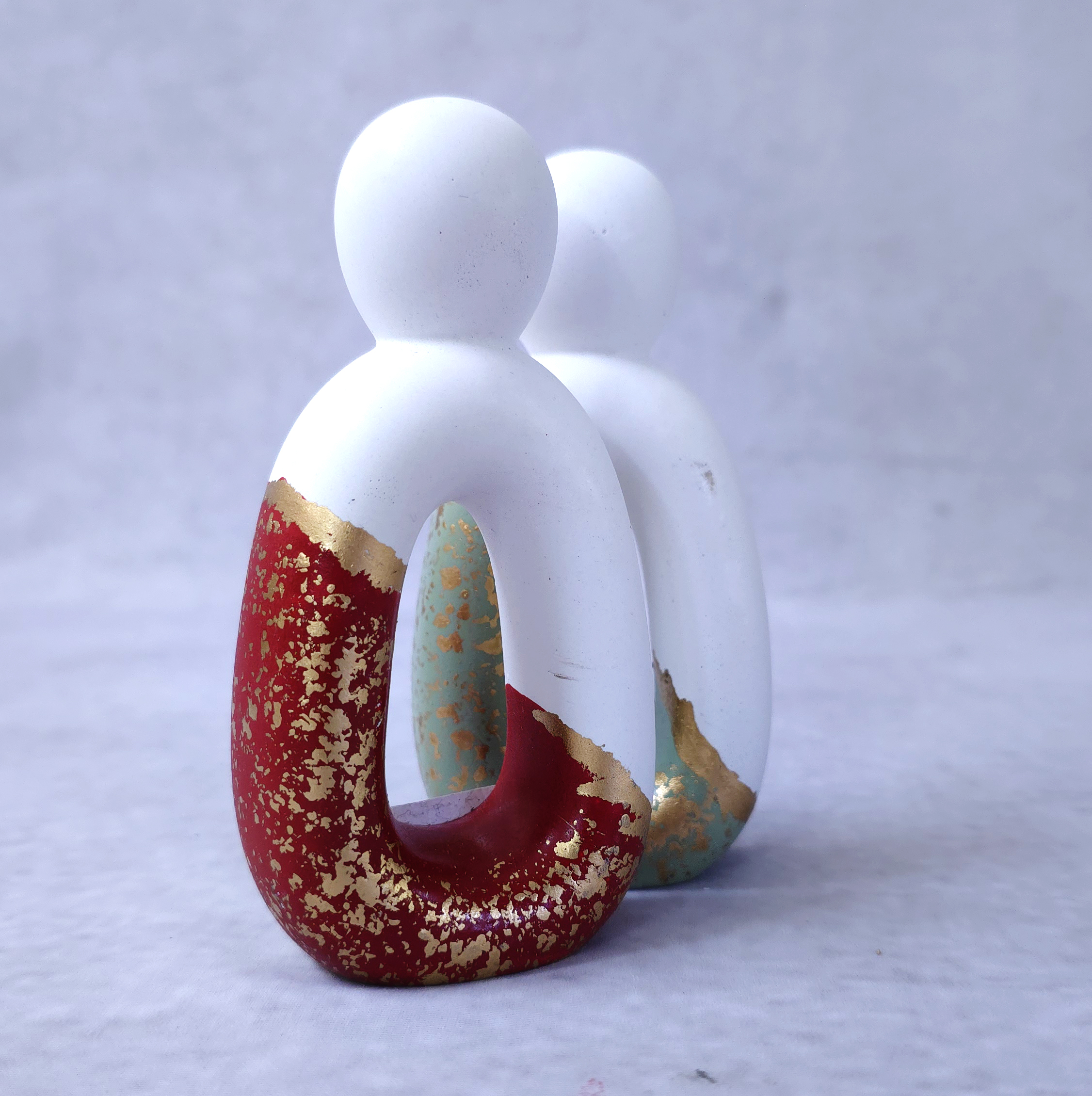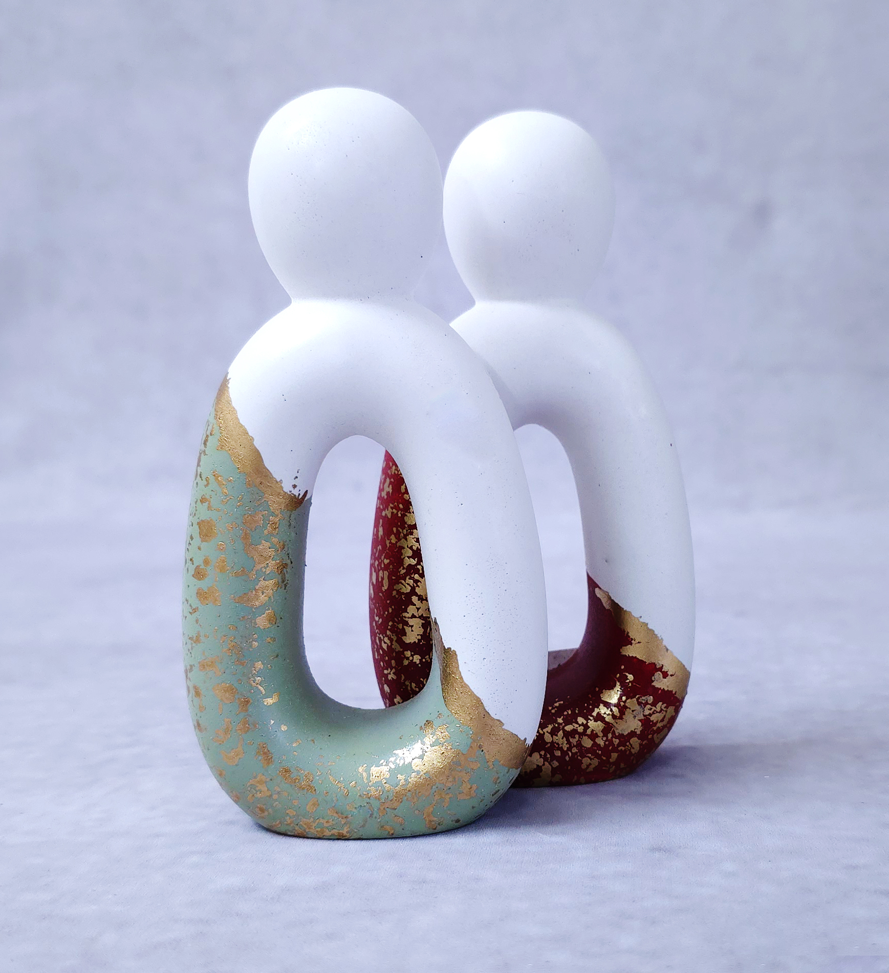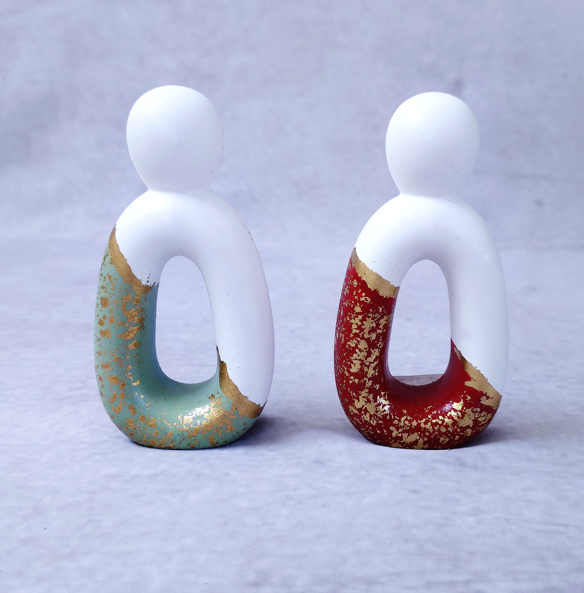 Δύο μινιμαλιστικά χριστουγεννιάτικα ψηλά αγαλματάκια με μοντέρνο χαρακτήρα — κομψές, ρευστές καμπύλες που σχηματίζουν την απαλή φιγούρα δύο μικρών ανθρωπάκων. Το ένα σε ζεστό, βαθύ κόκκινο και το άλλο σε δροσερή, απαλή μέντα· μαζί δημιουργούν μια διακριτική αλλά εντυπωσιακή αντίθεση. Η λιτή τους μορφή αποπνέει ηρεμία και γιορτινή αρμονία, χωρίς περιττές λεπτομέρειες — σαν μια σύγχρονη ερμηνεία της ανθρώπινης σύνδεσης μέσα στις γιορτές. Ένα ζευγάρι διακοσμητικών που αποπνέει κομψότητα, τρυφερότητα και minimal γιορτινή μαγεία.