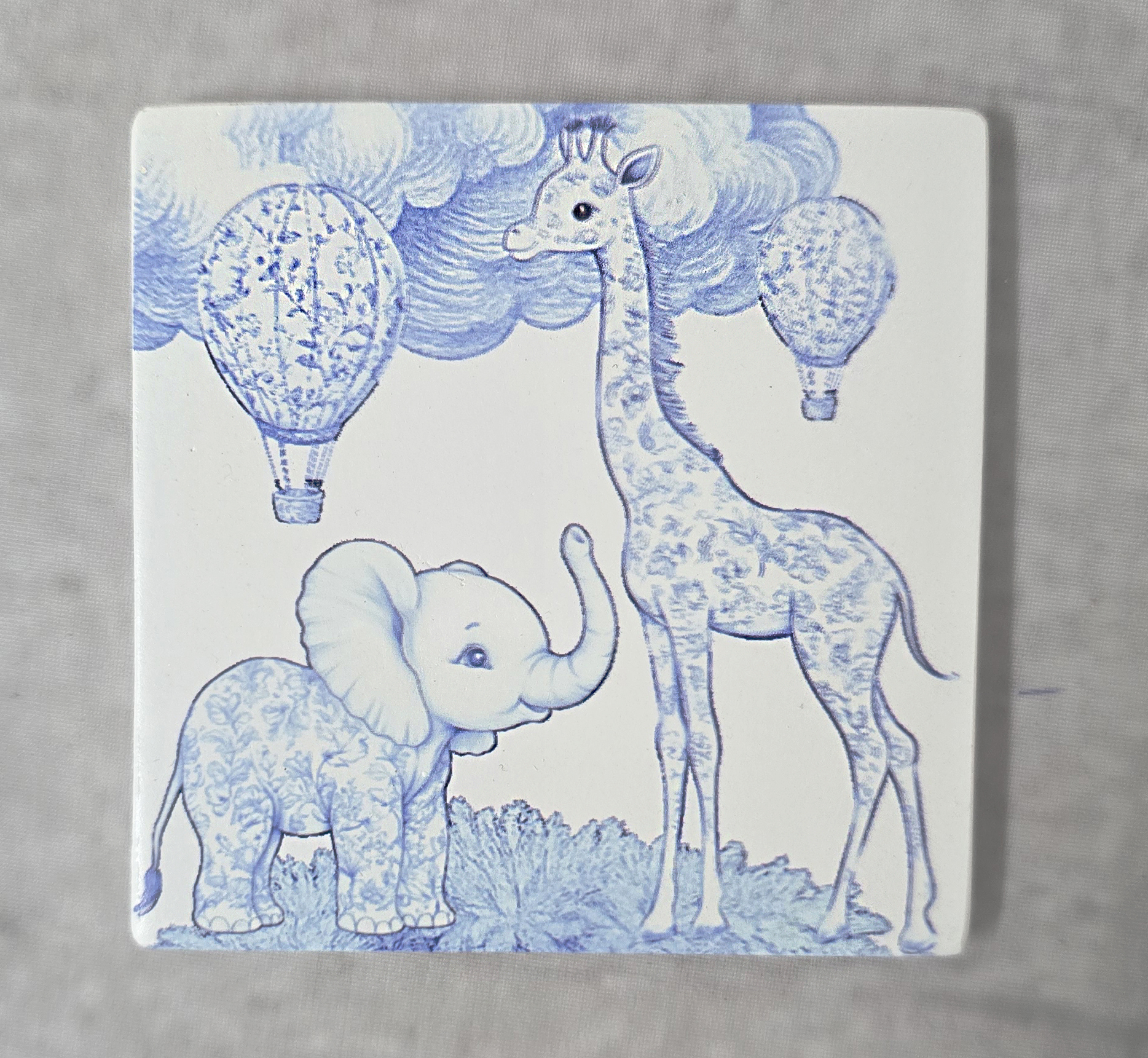 Κεραμικό σουβέρ με εκτύπωση σαφάρι σε κομψό στυλ Toile de Jouy, που απεικονίζει ζωάκια σαφάρι σε αποχρώσεις του μπλε. Ο κλασικός μονοχρωματικός σχεδιασμός, εμπνευσμένος από τη γαλλική διακοσμητική παράδοση, συνδυάζεται αρμονικά με παιχνιδιάρικο χαρακτήρα, δημιουργώντας ένα ιδιαίτερο και διαχρονικό αποτέλεσμα.
