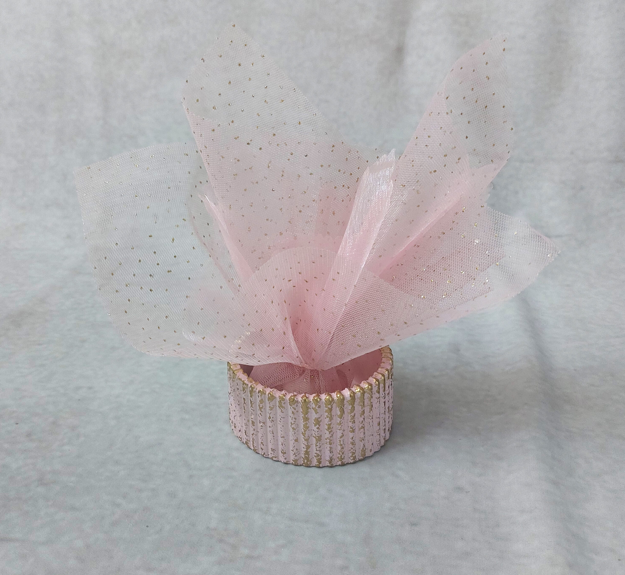 Mπομπονιέρα βάπτισης κεραμικό ρεσώ σε ροζ και χρυσή απόχρωση. Εσωτερικά περιέχει ροζ τούλι με χρυσό γκλίτερ και 7 κουφέτα smarties