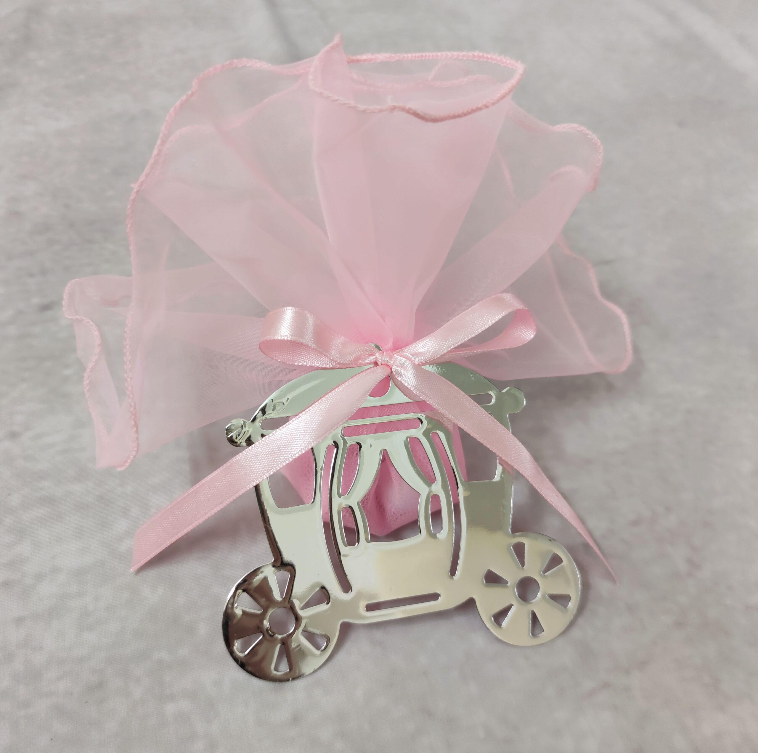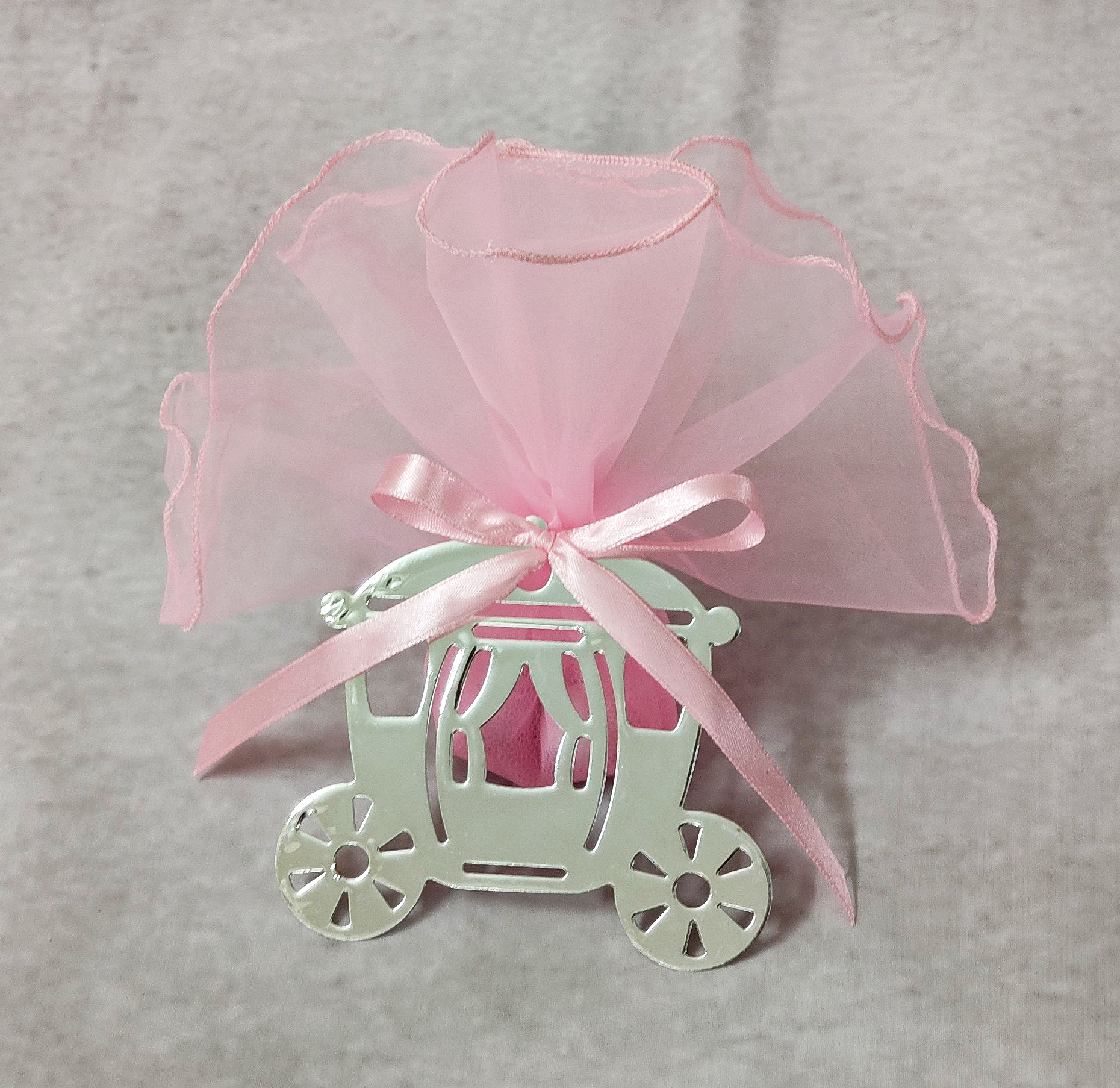 Mπομπονιέρα βάπτισης με ασημί μεταλλική άμαξα σε ροζ απόχρωση.