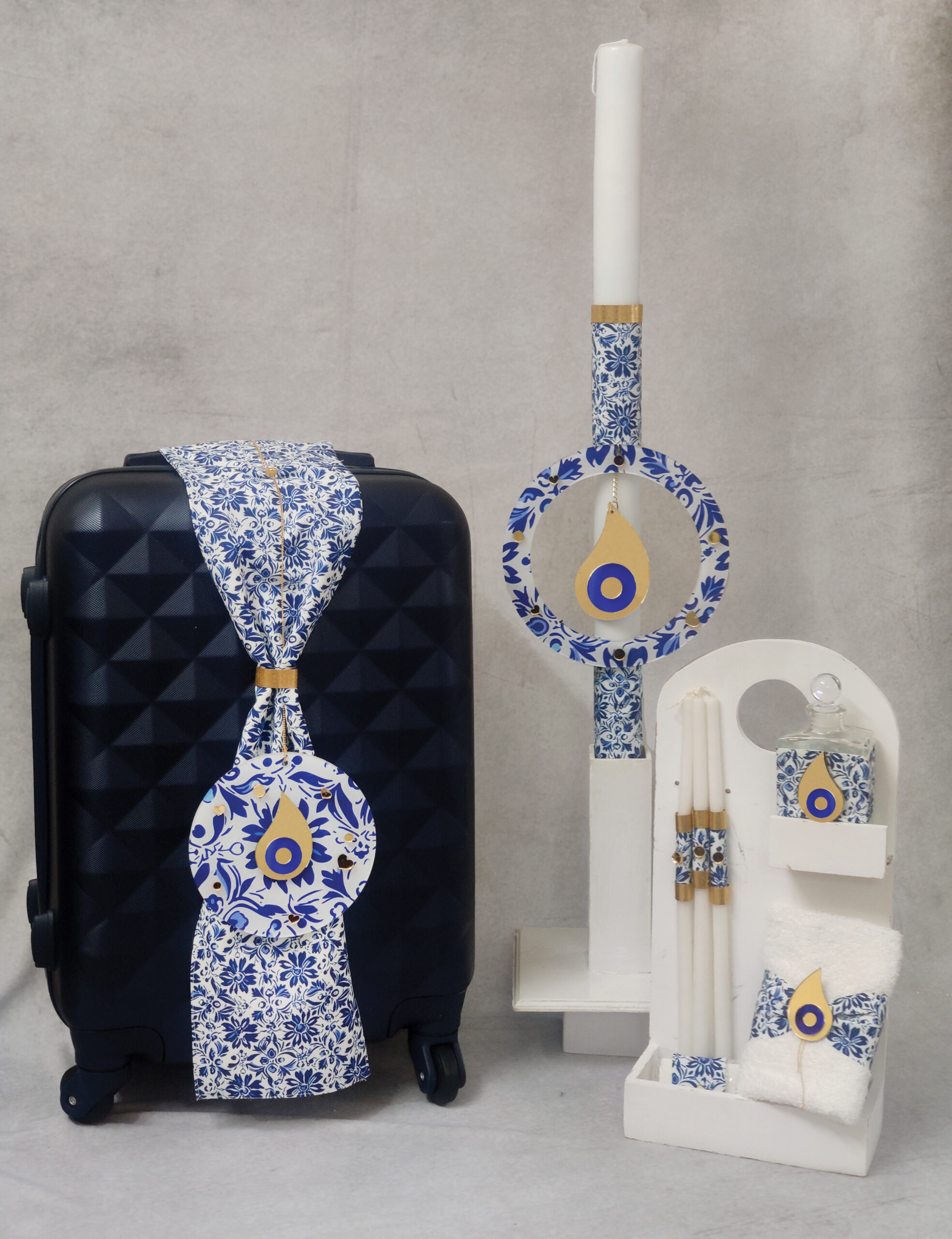 Πακέτο βάπτισης για αγόρι με θέμα μάτι με μοτίφ από λευκές και μπλε αποχρώσεις.