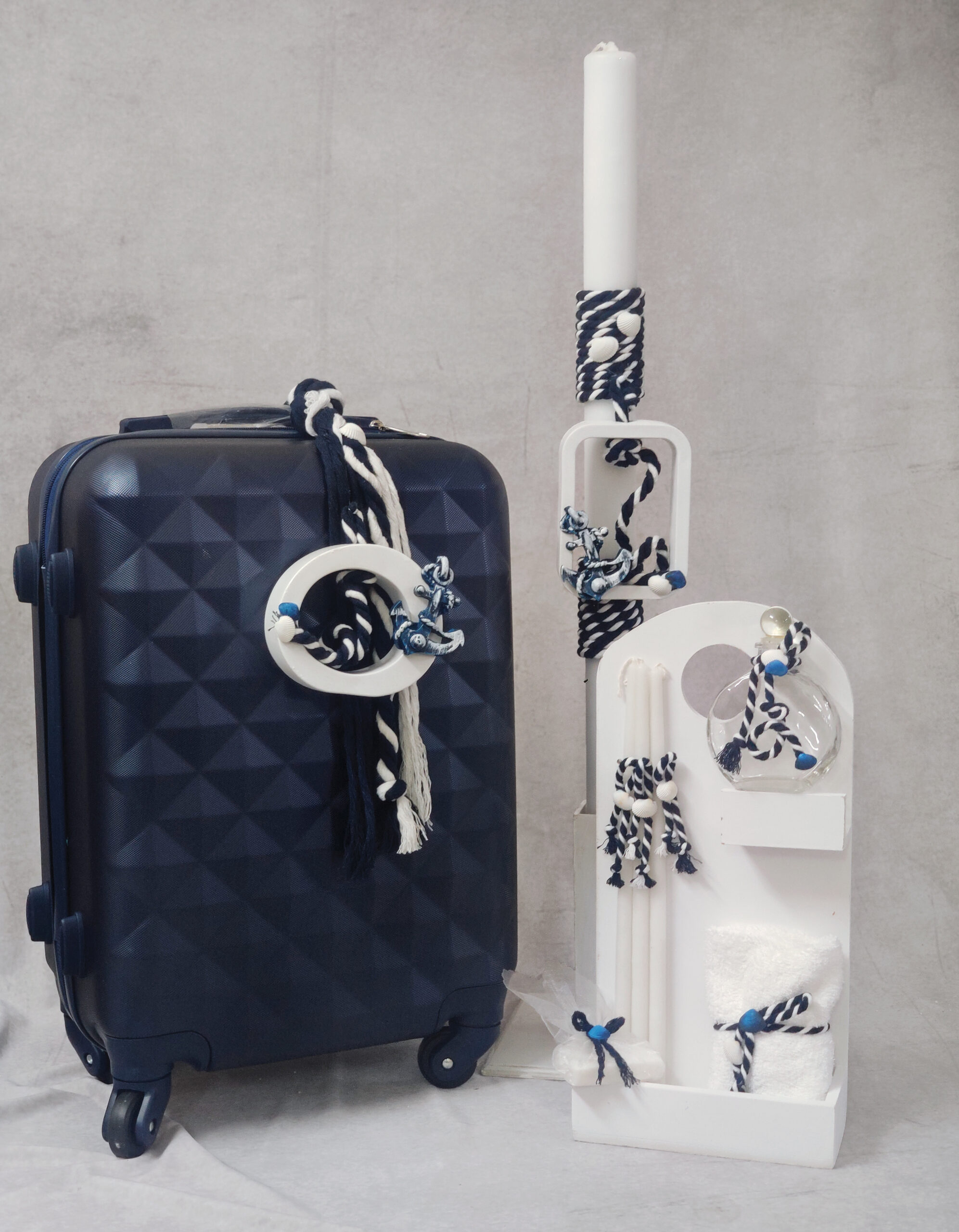 Πακέτο βάπτισης για αγόρι με θέμα άγκυρα σε λευκές και μπλε αποχρώσεις.